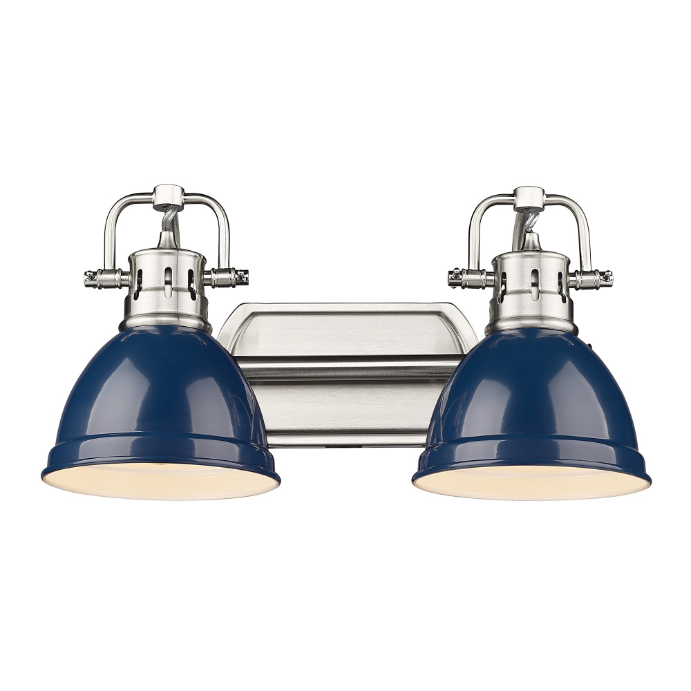 Embrace vibrant style with the Yep by Golden Lighting Duncan 2-light Vanity. Featuring a navy blue metal shade and a pewter frame, it delivers a striking presence in any space. The smooth navy shade evokes a sophisticated nautical feel, complemented by a polished, high-gloss finish that reflects its surroundings beautifully. Our pewter finish serves as an understated yet elegant counterpart with a timeless appeal. Rated for damp locations, this vanity light is appropriate for bathrooms and other covered areas. The adjustable directional heads allow you to highlight specific spaces effortlessly. With overall dimensions of 16.5"W x 8.5"H x 8.25"D, this fixture requires 2 E26 Medium base bulbs (not included), with a maximum wattage of 100 per bulb. The Duncan 2-light Vanity is perfect for those seeking a blend of classic and contemporary design with practical functionality.