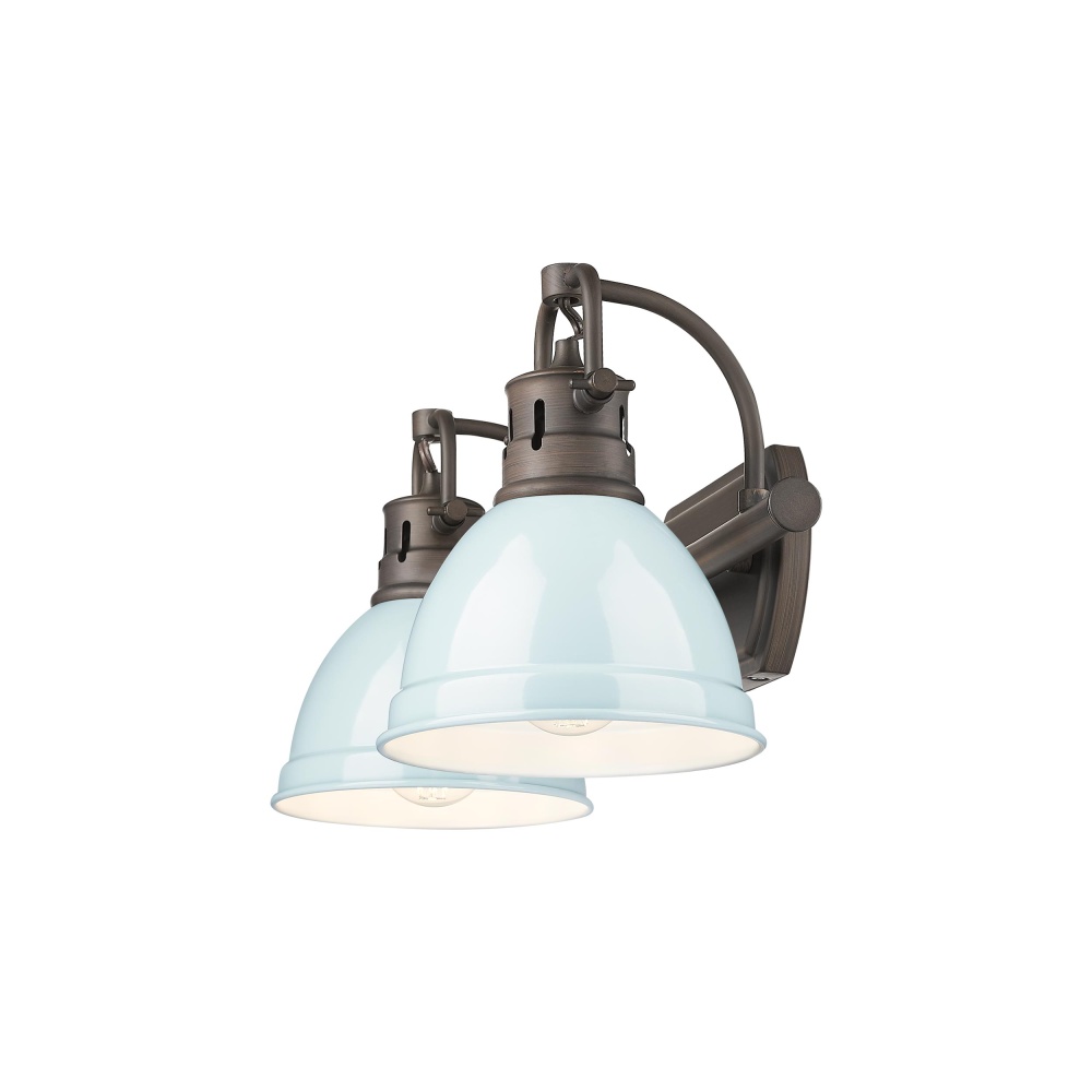 Bring traditional charm into your home with the Yep by Golden Lighting Duncan 2-light Vanity. Featuring a metal shade and a rubbed bronze frame, it creates an inviting atmosphere. The Seafoam metal shade showcases a light pastel blue-green color with a high-gloss, enamel-like sheen, reminiscent of vintage enamelware. Its smooth, reflective surface brightens your space while adding a touch of coastal charm. With a hand-rubbed appearance, our Rubbed Bronze finish provides a warm and inviting glow that complements various design styles from farmhouse to industrial. Perfect for brightening up bathrooms, this fixture is Damp Location Rated, making it suitable for covered and semi-enclosed spaces like bathrooms and laundry rooms. With adjustable directional heads, you can customize the lighting to highlight areas as needed. Overall Dimensions: 16.5"W x 8.5"H x 8.25"D. Requires 2 E26 Medium base bulbs (not included), max 100 wattage per bulb. Elevate your decor with quality craftsmanship and distinctive style.