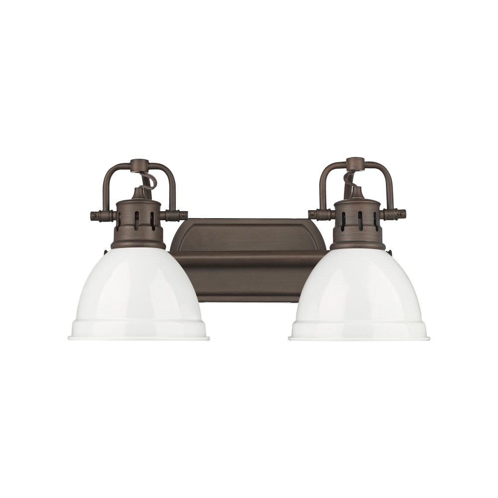 Bring rustic elegance into your home with the Yep by Golden Lighting Duncan 2-light Vanity. Featuring a metal shade and a Rubbed Bronze frame, it creates a welcoming atmosphere. The gleaming metal shade in white offers a highly reflective surface that enhances light diffusion, while its smooth texture reflects a classic, timeless utility style. The Rubbed Bronze finish is a versatile choice, delicately balancing classic warmth with contemporary charm, making it an ideal complement to any decor. Brighten up bathrooms with dedicated lighting that provides practical task illumination. This fixture is Damp Location Rated, suitable for covered and semi-enclosed spaces with occasional moisture. Its adjustable directional heads allow you to customize the lighting to highlight specific areas. Overall Dimensions: 16.5"W x 8.5"H x 8.25"D. Requires 2 E26 Medium base bulbs (not included), with a maximum wattage of 100 per bulb. The classic design and quality craftsmanship of the Yep by Golden Lighting Duncan 2-light Vanity make it a perfect choice for enhancing your home’s ambiance with style.