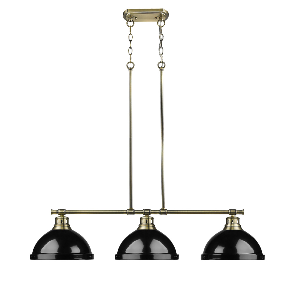 Bring farmhouse elegance into your home with the Yep by Golden Lighting Duncan 3-light Island Light. Featuring a metal shade and an aged brass frame, it creates a welcoming atmosphere. The metal shade in a glossy black finish makes a bold statement, reflecting light beautifully and adding a touch of modern glamour. The aged brass finish offers a warm, inviting glow, reminiscent of vintage heirlooms. Ideal for kitchen islands, this fixture is dry location rated, ensuring safety in indoor spaces, and is designed with a convertible feature allowing adjustable height for both sloped and flat ceilings. Overall dimensions are 40"W x 8.5"H x 10.88"D, and it requires three E26 medium base bulbs (not included), with a maximum wattage of 100 per bulb. Elevate your home with this quality lighting solution that blends functionality with style.