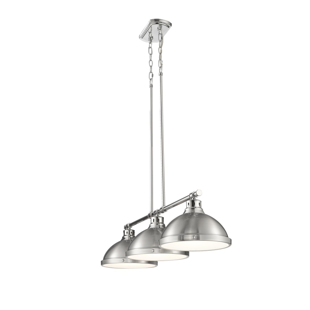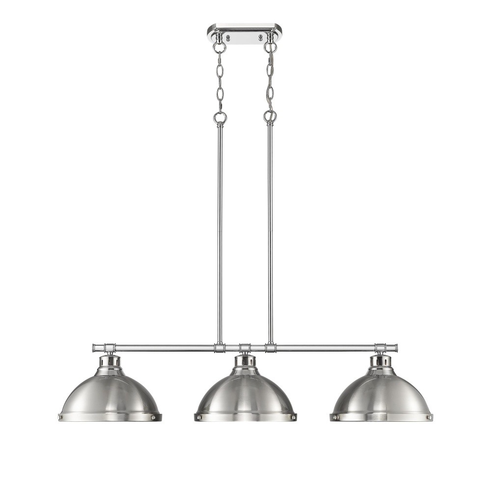 Bring farmhouse elegance into your home with the Yep by Golden Lighting Duncan 3-light Island Light. Featuring a metal shade and a polished chrome frame, it creates a welcoming atmosphere. The pewter metal shade provides a soft and classic alternative, distinguished by its brushed texture that gently diffuses light, creating an elegant glow. It enhances the fixture’s charm while blending seamlessly with its polished chrome finish. The brilliant polished chrome finish offers a bright, clean look, making it versatile and suitable for various decor styles. This light is tailored for kitchen islands, rated for dry locations, ideal for areas not subject to moisture. Its convertible design allows for adjustable height, with installation options as a semi-flush mount or pendant, from 13.125" to 63" high. Overall dimensions are 40"W x 8.5"H x 10.88"D. It requires 3 E26 medium base bulbs (not included), with a maximum wattage of 100 per bulb. Enhance your home with this exquisite fixture that combines function and stylish appeal.