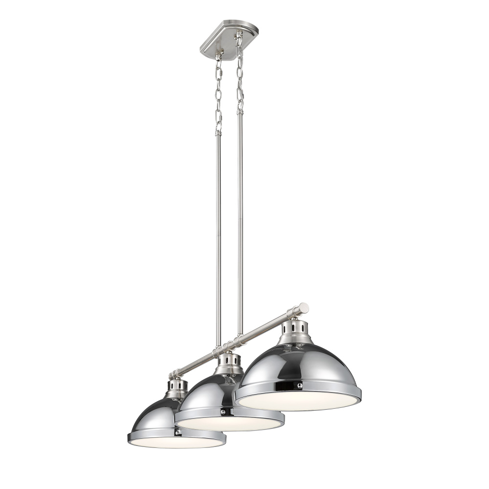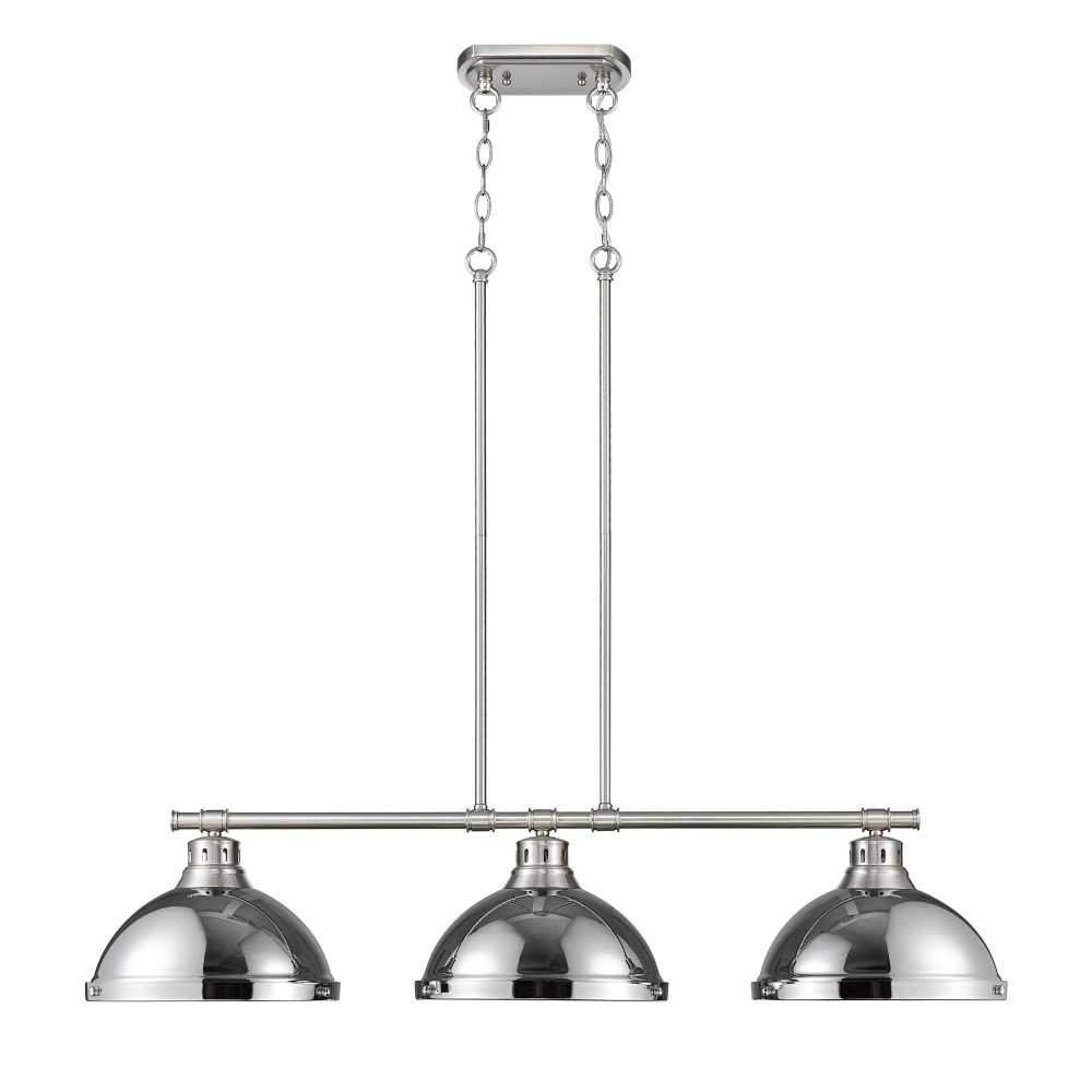 Bring farmhouse elegance into your home with the Yep by Golden Lighting Duncan 3-light Island Light. Featuring a metal shade and a pewter frame, it creates a welcoming atmosphere. The polished chrome metal shade delivers a bright, highly reflective finish, adding a touch of sleek sophistication that enhances the light's overall effect. Finished in our classic Pewter, this light provides an elegant glow with a satin lustre that diffuses light beautifully, bridging traditional charm and modern design. Designed for kitchen islands, this fixture is Dry Location Rated, making it perfect for dining areas and living spaces. Its Convertible Design allows installation as a semi-flush mount or pendant, with an adjustable height feature ranging from 13.125" to 63". Overall dimensions stand at 40"W x 8.5"H x 10.88"D, and it requires 3 E26 Medium base bulbs (not included) with a maximum wattage of 100 per bulb. Enhance your decor with the timeless quality of Yep by Golden Lighting, where style meets functionality.