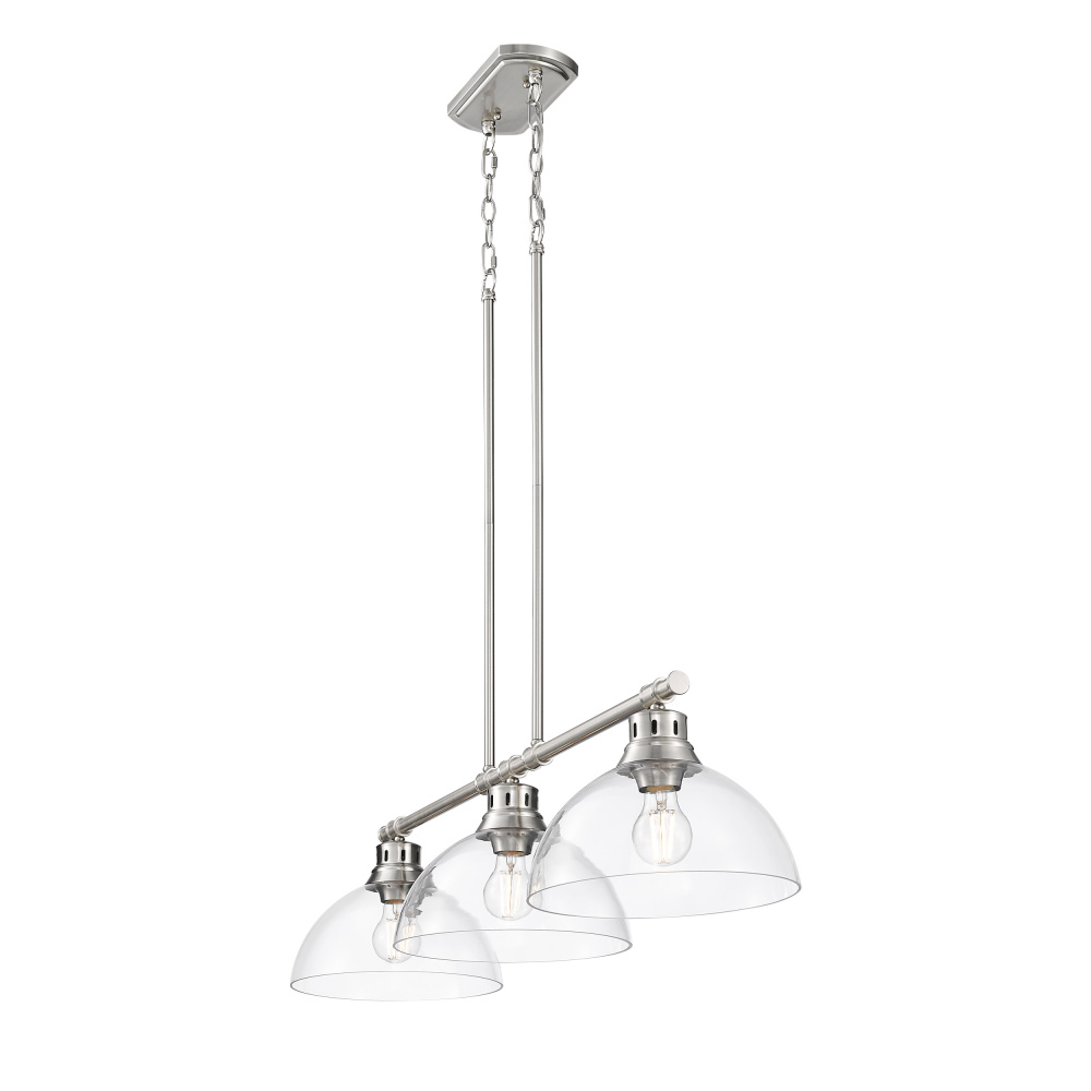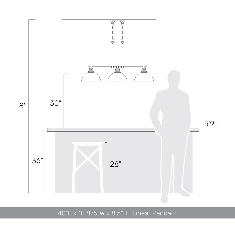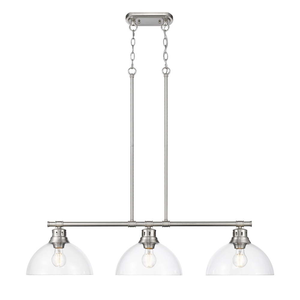 Add timeless charm to your kitchen with the Yep by Golden Lighting Duncan 3-light Island Light. Featuring Clear Glass shades and a Pewter finish, it provides bright illumination that transforms your space into a culinary haven. The Clear Glass shades allow for an unobstructed view of the bulbs, enhancing the overall light effect while adding a polished touch to the rustic design. The Pewter finish brings subtle warmth and sophistication, making this fixture a perfect fit for Farmhouse and contemporary settings. Designed for versatility, it is Dry Location Rated and ideal for indoor spaces like kitchens and living rooms. The fixture's dimensions of 40"W x 8.5"H x 10.88"D require 3 E26 Medium base bulbs (not included), with a max wattage of 100 each. The customizable design allows for installation as either a pendant or semi-flush mount, with an adjustable height from 13.125" to 63". Elevate your dining experience with this versatile lighting option that marries rustic charm with modern functionality.