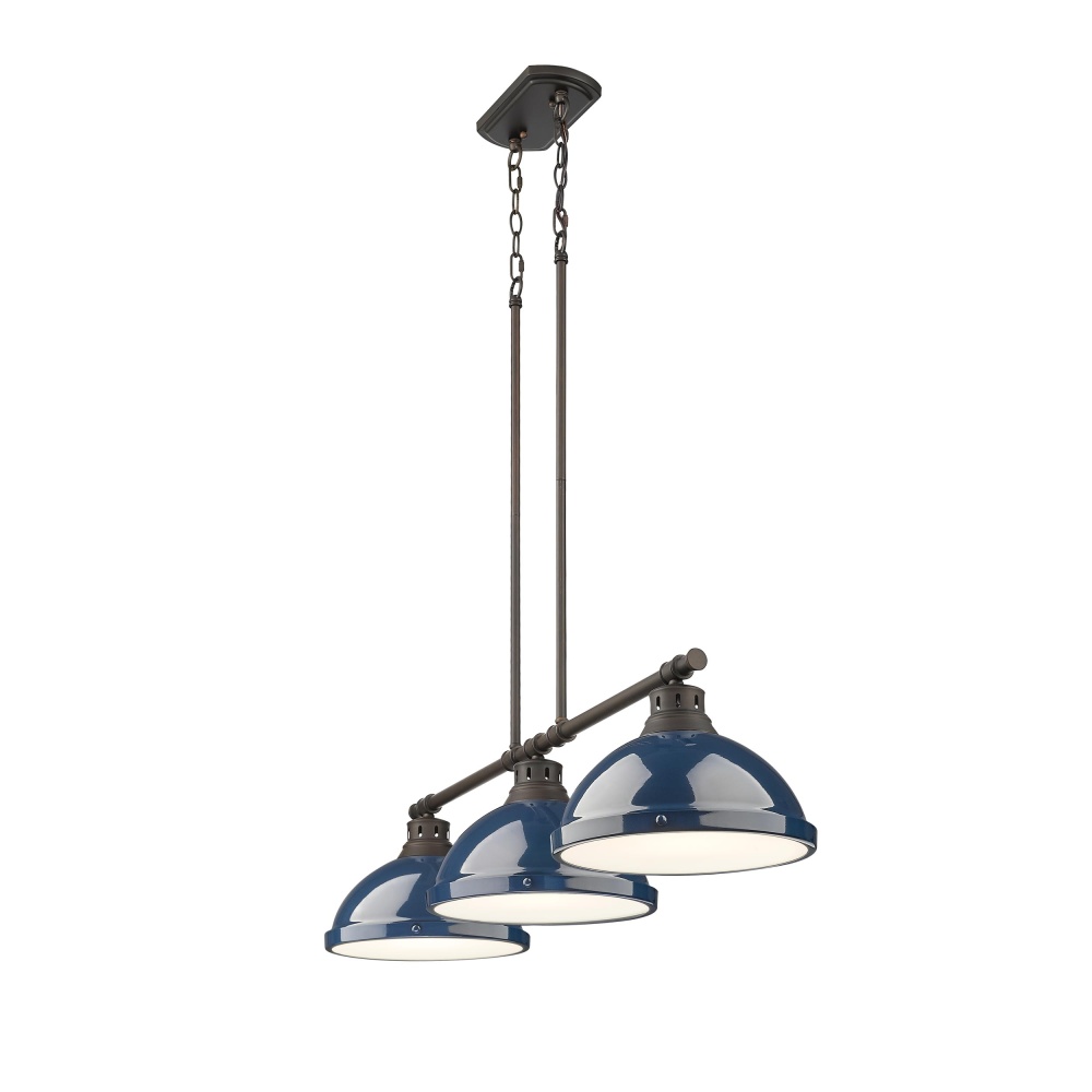 Add a unique touch to your home with the Yep by Golden Lighting Duncan 3-light Island Light. Featuring a navy blue metal shade and a Rubbed Bronze frame, it creates an inviting atmosphere that stands out. The bold navy blue metal shade offers a striking visual appeal, enhancing the lighting effect while adding a sophisticated pop of color that transforms any space. Its durable finish reflects the surrounding light, enriching the warm glow. The timeless Rubbed Bronze finish complements the design and suits various aesthetics from traditional to modern farmhouse styles, making it a versatile addition to any room. Perfectly crafted for kitchen islands, this light is Dry Location Rated, ideal for dry indoor settings. With its convertible design, you can easily adjust the height to fit your space, ranging from 13.125" to 63". Overall Dimensions: 40"W x 8.5"H x 10.88"D. Requires 3 E26 Medium base bulbs (not included, max 100 wattage per bulb) to fill your space with ambient light during meals or gatherings. Transform your living area with this quality fixture, blending style and craftsmanship seamlessly.