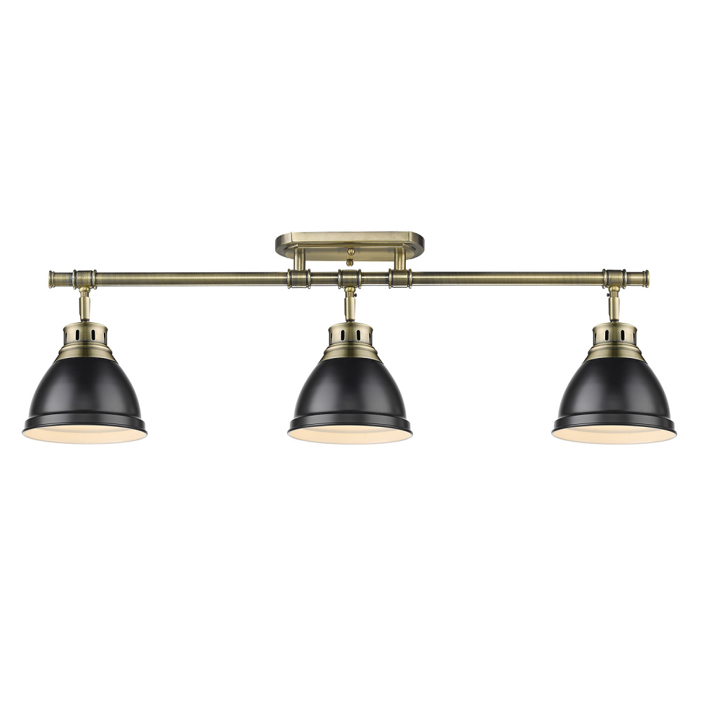 Bring farmhouse elegance into your home with the Yep by Golden Lighting Duncan 3-light Semi-Flush Mount. Featuring a metal shade and an Aged Brass frame, it creates a welcoming atmosphere. The metal shade boasts a classic Matte Black finish, offering a clean, modern style that absorbs light to create a soft, sophisticated look. Embrace the warmth of the Aged Brass finish, crafted through electroplating for a durable and timeless appeal. This fixture is perfect for entryways, bedrooms, kitchens, and living areas with mid-height ceilings, rated for damp locations to suit covered and semi-enclosed spaces. Installation is a breeze with adjustable directional heads, allowing you to customize the lighting. Overall dimensions are 35.38"W x 10.75"H x 6.5"D, and it requires three E26 medium base bulbs (not included) with a maximum wattage of 100 each. Elevate your space with this stylish and quality fixture.