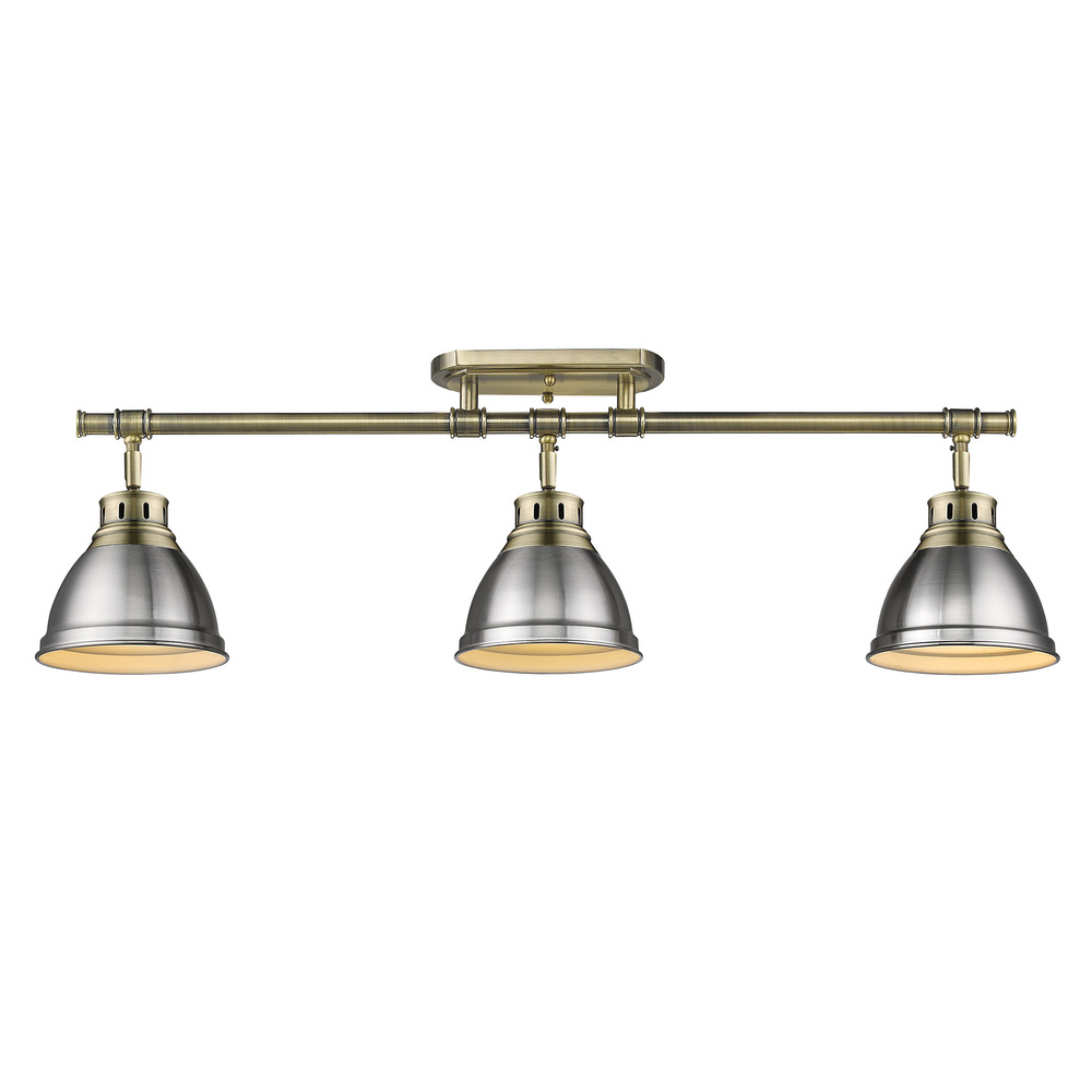 Bring timeless elegance into your home with the Yep by Golden Lighting Duncan 3-light Semi-Flush Mount. Featuring a metal shade and an aged brass frame, it creates a welcoming atmosphere. The pewter metal shade provides a warm silver-grey hue with a brushed texture that beautifully diffuses light, ensuring an inviting glow in any space. Embrace luxury with our durable electroplated aged brass finish, designed to catch the eye and complement traditional, transitional, or industrial aesthetics. Ideal for entryways, bedrooms, kitchens, and living areas with mid-height ceilings, it's damp location rated for spaces with occasional moisture. Adjustable directional heads allow you to customize lighting to highlight specific areas, while the overall dimensions of 35.38"W x 10.75"H x 6.5"D require three E26 medium base bulbs (not included, max 100 wattage per bulb). Elevate your décor with this classic fixture that brings character and charm to your home.