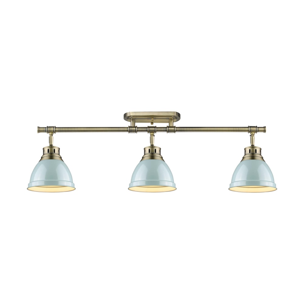 Bring timeless elegance into your home with the Yep by Golden Lighting Duncan 3-light Semi-Flush Mount. Featuring a metal shade and an aged brass frame, it creates a welcoming atmosphere. The seafoam metal shade introduces a light, pastel blue-green hue, polished to a high-gloss sheen that joyfully reflects light throughout your space. Embrace luxury with our durable electroplated aged brass finish, designed to catch the eye and complement traditional, transitional, or industrial aesthetics. Ideal for entryways, bedrooms, kitchens, and living areas with mid-height ceilings, it's damp location rated for spaces with occasional moisture. Adjustable directional heads allow you to customize lighting to highlight specific areas, while the overall dimensions of 35.38"W x 10.75"H x 6.5"D require three E26 medium base bulbs (not included, max 100 wattage per bulb). Elevate your décor with this classic fixture that brings character and charm to your home.