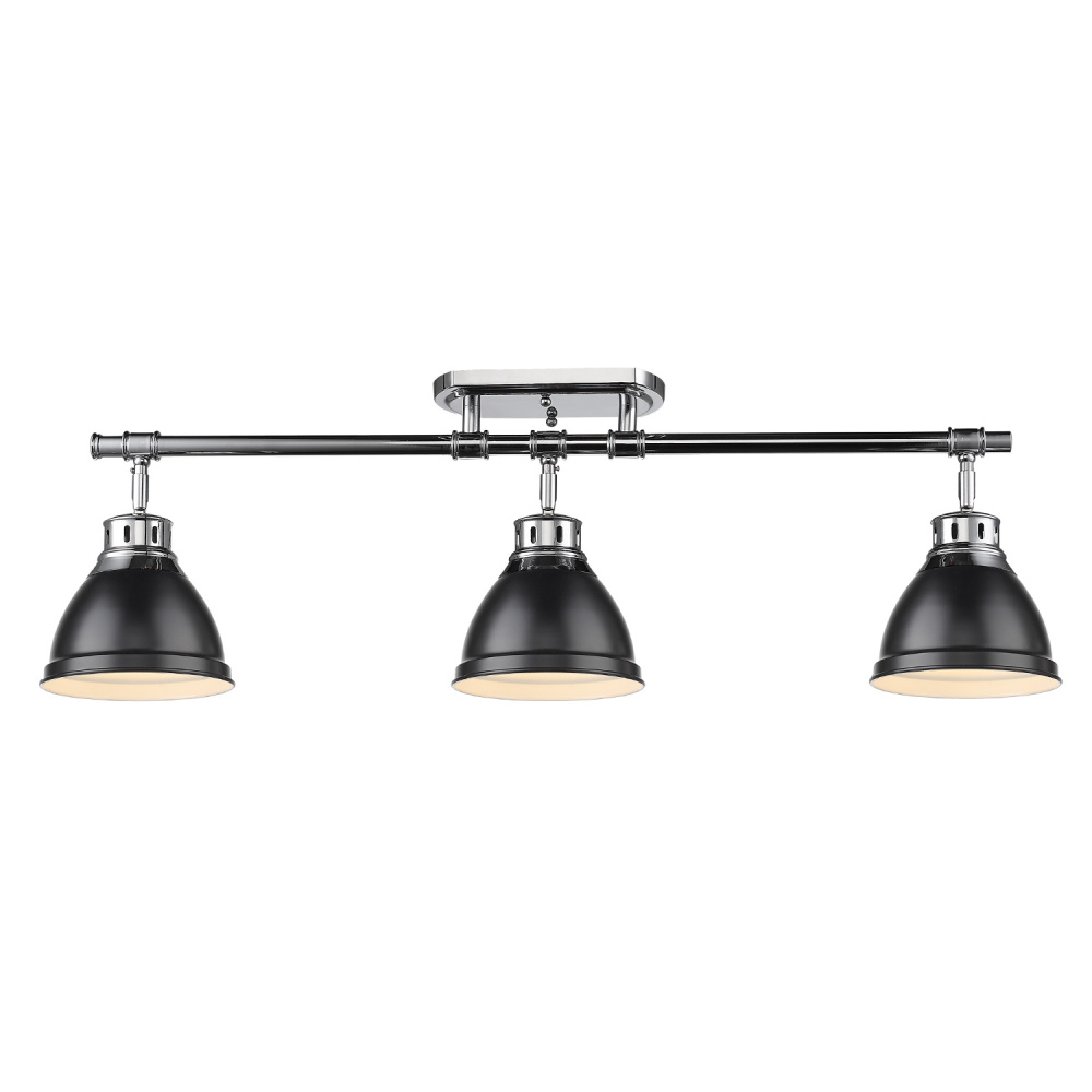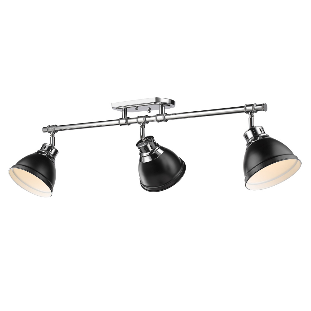 Bring a refined touch into your home with the Yep by Golden Lighting Duncan 3-light Semi-Flush Mount. Featuring a matte black shade paired with a polished chrome frame, it infuses any room with a pleasantly inviting ambiance. The metal shade in matte black features a smooth, non-reflective finish that absorbs light, creating a soft and sophisticated atmosphere. This understated elegance enhances any decor from contemporary to traditional. The polished chrome finish further elevates the piece, providing a clean, durable aesthetic. Its easy-to-maintain surface is designed for longevity, making it perfect for any setting. Ideal for entryways, bedrooms, kitchens, and living areas with mid-height ceilings, this light is damp location rated, suitable for use in covered spaces such as bathrooms and laundry rooms. Its adjustable directional heads allow you to focus lighting where it's needed most. Overall dimensions measure 35.38"W x 10.75"H x 6.5"D, requiring three E26 medium base bulbs (not included) with a maximum wattage of 100 each, ensuring ample light throughout your spaces. Quality and style converge in the Yep by Golden Lighting Duncan fixture, adding a dash of character to any decor while serving a functional purpose.