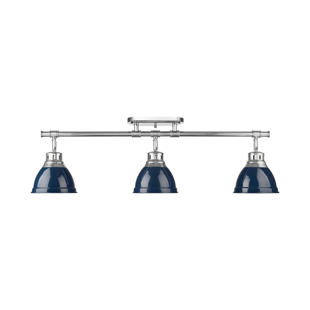Bring timeless elegance into your home with the Yep by Golden Lighting Duncan 3-light Semi-Flush Mount. Featuring a navy blue metal shade and a Chrome frame, it creates a welcoming atmosphere. The navy blue shade offers a bold and sophisticated pop of color, featuring a high-gloss finish that beautifully reflects light, enhancing the overall ambiance of your space. This fixture's versatile design makes it perfect for entryways, bedrooms, kitchens, and living areas with mid-height ceilings. It is damp location rated, allowing compatibility with covered and semi-enclosed spaces with occasional moisture. Adjust the directional heads to highlight specific decor elements or areas. Overall Dimensions: 35.38"W x 10.75"H x 6.5"D. Requires 3 E26 Medium base bulbs (not included), max 100W per bulb. Experience the fusion of modern style and practical design in your home with this beautiful lighting fixture.