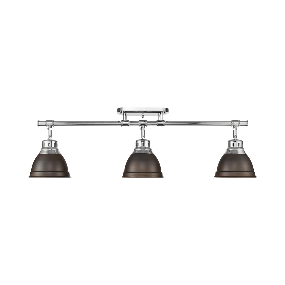Bring rustic elegance into your home with the Yep by Golden Lighting Duncan 3-light Semi-Flush Mount. Featuring a metal shade and a chrome frame, it creates a welcoming atmosphere. The metal shade showcases a Rubbed Bronze finish featuring a rich, dark brown color with a brushed texture, reflecting warm coppery highlights. Its subtle warmth complements various decor styles. Brilliant and timeless, our Polished Chrome finish offers a sleek, clean look that brightens any space and is easy to clean. This light fixture is damp location rated, suitable for covered or semi-enclosed areas such as bathrooms and porches. The adjustable directional heads allow you to customize the light to highlight specific areas or objects. Overall Dimensions: 35.38"W x 10.75"H x 6.5"D. Requires 3 E26 Medium base bulbs (not included), with a maximum wattage of 100 per bulb. Add a touch of timeless charm to your home with this quality fixture, perfect for any country-inspired interior.