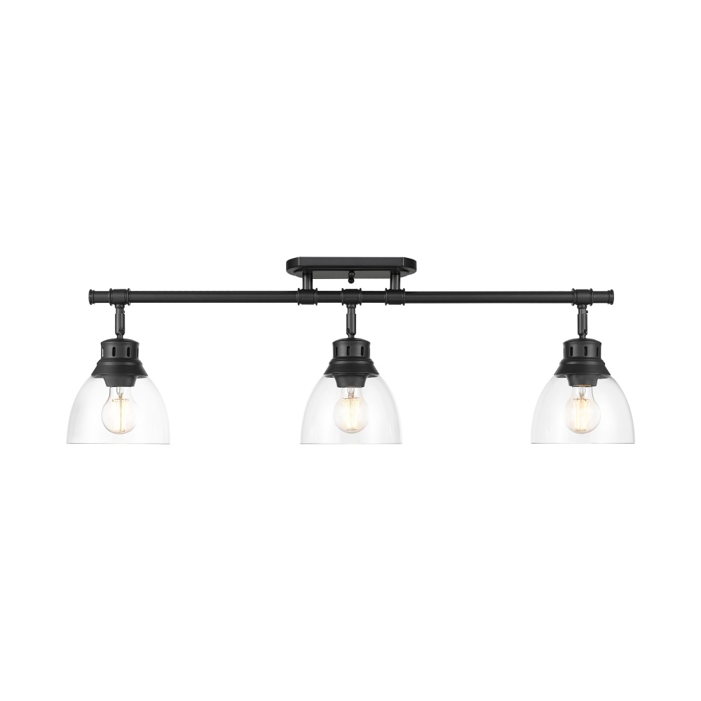 Bring traditional elegance into your home with the Yep by Golden Lighting Duncan 3-light Semi-Flush Mount. Featuring a glass shade and a matte black frame, it creates a welcoming atmosphere. The clear glass shade showcases brilliant illumination, while its polished finish allows the beauty of the bulb and fixture to take center stage. The epitome of clean, modern style, the matte black finish is both timeless and versatile, suitable for any decor from minimalist to industrial. Designed for a blend of style and practicality, this fixture is suitable for covered and semi-enclosed spaces, perfect for entryways, bedrooms, kitchens, and living areas with mid-height ceilings. The adjustable directional heads let you customize the lighting to highlight specific areas or objects. With overall dimensions of 35.38"W x 10.75"H x 6.5"D, the fixture requires three E26 medium base bulbs (not included), with a maximum of 100 watts per bulb. Introduce a touch of timeless, rustic charm into your home with quality craftsmanship and stylish functionality.