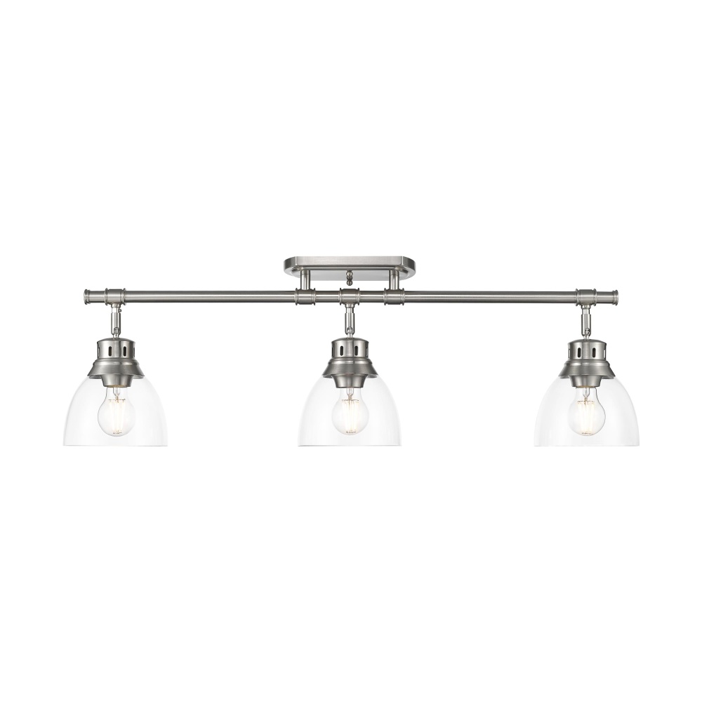 Bring classic elegance into your home with the Yep by Golden Lighting Duncan 3-light Semi-Flush Mount. Featuring a clear glass shade and a Pewter frame, it creates a welcoming atmosphere. The clear glass shade showcases a perfectly transparent finish, allowing unobstructed light to shine brilliantly in your space. This simple yet versatile design elevates any decor style—from modern farmhouse to classic contemporary. Our Pewter finish offers a soft and classic alternative to brighter silver tones, created through a durable electroplating process that imparts a satin lustre, ideal for both traditional and modern interiors. This fixture is versatile for entryways, bedrooms, kitchens, and living areas with mid-height ceilings. Damp Location Rated, it is suitable for spaces with occasional moisture. The adjustable directional heads allow you to customize the lighting to highlight specific areas or objects. Overall Dimensions: 35.38"W x 10.75"H x 6.5"D. Requires 3 E26 Medium base bulbs (not included) with a maximum wattage of 100 per bulb. Enhance your living space with a high-quality fixture designed to blend style and functionality seamlessly.