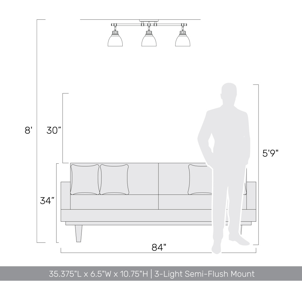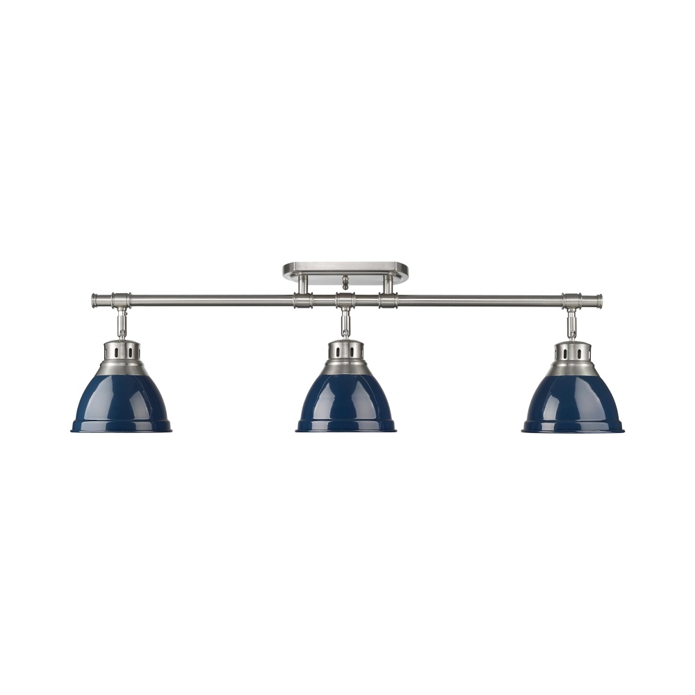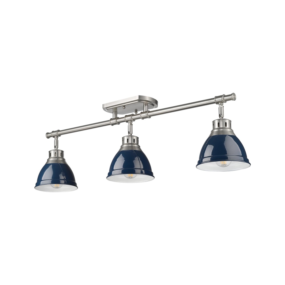 Bring a touch of nautical elegance into your home with the Yep by Golden Lighting Duncan 3-light Semi-Flush Mount. Featuring a Navy Blue metal shade and a Pewter frame, it creates a welcoming atmosphere. The Navy shade features a rich, deep color with a high-gloss finish, reflecting light beautifully and adding a striking contrast to your decor. This bold finish complements the Pewter frame, enhancing the overall design. Our Pewter finish offers a soft and classic alternative to brighter silver tones, created through a durable electroplating process that imparts a satin lustre, making it an ideal choice for both traditional and contemporary spaces. Designed for versatility, this fixture is perfect for entryways, bedrooms, kitchens, and living areas with mid-height ceilings. With a Damp Location Rating, it is suitable for spaces with occasional moisture. The adjustable directional heads allow you to customize the lighting to highlight specific areas or objects. Overall Dimensions: 35.38"W x 10.75"H x 6.5"D. Requires 3 E26 Medium base bulbs (not included) with a maximum wattage of 100 per bulb. Add a bold statement to your home with a fixture that marries style and functionality effortlessly.