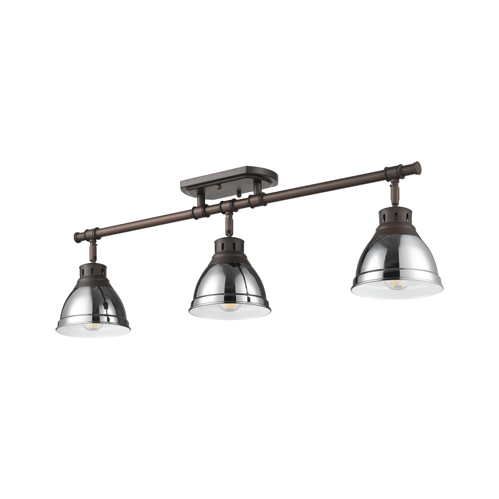 Embrace vintage-inspired charm in your home with the Yep by Golden Lighting Duncan 3-light Semi-Flush Mount. Featuring a Metal shade and a Rubbed Bronze frame, it creates a captivating atmosphere. The Metal shade showcases a dazzling Polished Chrome finish that reflects light, providing a brilliant shine while adding a contemporary touch to your decor. The Rubbed Bronze finish provides warmth with subtle highlights that complement a wide range of styles, from traditional to industrial, ensuring versatility across various aesthetics. This fixture is perfect for entryways, kitchens, and living areas with mid-height ceilings. Damp Location Rated, it’s suitable for covered spaces dealing with occasional moisture. Enjoy the adjustable directional heads for focused illumination where you need it most. Overall Dimensions: 35.38"W x 10.75"H x 6.5"D, Requires 3 E26 Medium base bulbs (not included), max 100 wattage per bulb. Enhance your living space with this enchanting fixture, where timeless design meets modern functionality.