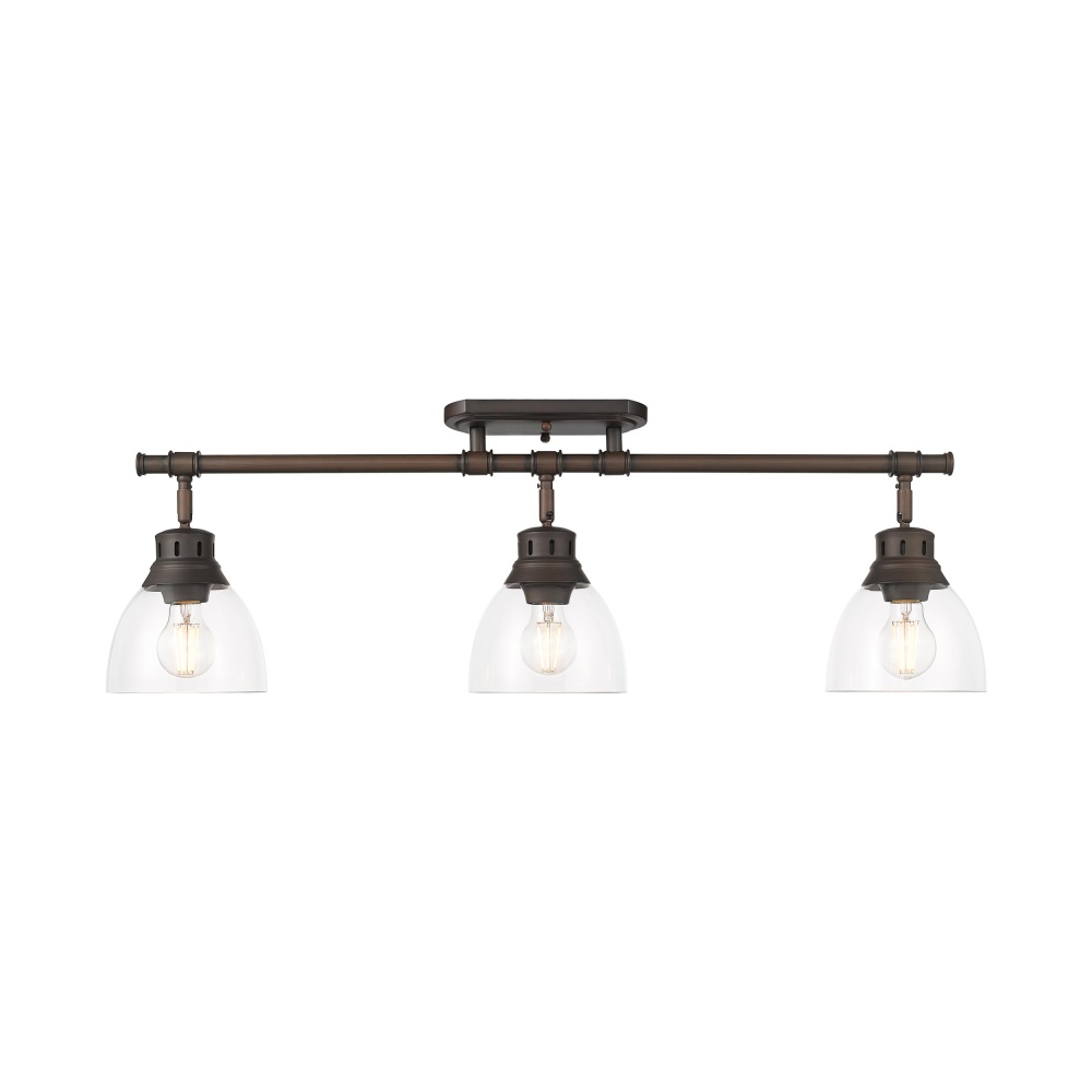 Bring a touch of elegance into your home with the Yep by Golden Lighting Duncan 3-light Semi-Flush Mount. Featuring a Clear Glass shade and a Rubbed Bronze frame, it establishes a sophisticated atmosphere. The Clear Glass shade provides unobstructed light, allowing the beauty of the bulbs and the fixture’s design to shine through, ideal for achieving a bright, clear ambiance. The Rubbed Bronze finish enriches the design with warmth and depth, making it versatile enough to complement different styles, from traditional to modern farmhouse. Perfect for entryways, bedrooms, kitchens, and living areas with mid-height ceilings, this fixture is Damp Location Rated, making it suitable for covered areas that occasionally experience moisture. Customize your lighting experience with flat directional heads for your specific lighting needs. Overall Dimensions: 35.38"W x 10.75"H x 6.5"D, Requires 3 E26 Medium base bulbs (not included), max 100 wattage per bulb. Elevate your decor with this beautifully designed fixture, where functionality meets style.