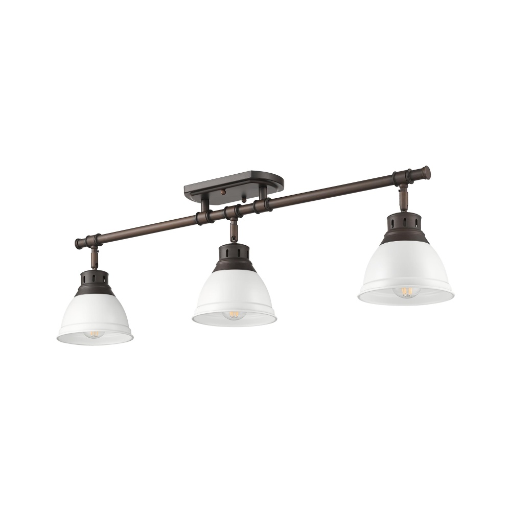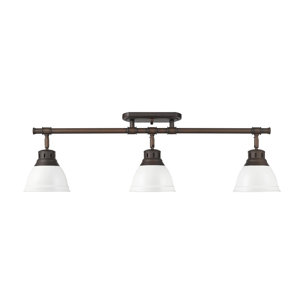 Elevate your space with modern sophistication through the Yep by Golden Lighting Duncan 3-light Semi-Flush Mount. Featuring a metal shade and a stunning Rubbed Bronze frame, this fixture provides a warm and inviting glow. The metal shade comes in a Matte White finish, which boasts a smooth, non-reflective surface that beautifully absorbs light. This finish embodies modern minimalism, creating an understated yet elegant look suitable for various interior styles, from Scandinavian to industrial-chic. The Rubbed Bronze finish adds a timeless quality, perfectly balancing rustic charm with contemporary design. This semi-flush mount is ideal for entryways, bedrooms, and kitchens with mid-height ceilings. Damp location rated, it can be used in spaces with occasional moisture, while its adjustable directional heads let you customize the focus of your lighting. Overall Dimensions: 35.38"W x 10.75"H x 6.5"D. It requires 3 E26 Medium base bulbs (not included), with a maximum wattage of 100. Experience the perfect blend of style, quality, and functionality for every corner of your home.