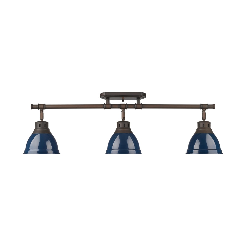 Bring traditional elegance into your home with the Yep by Golden Lighting Duncan 3-light Semi-Flush Mount. Featuring a metal shade and a Rubbed Bronze frame, it creates a welcoming atmosphere. The Navy Blue metal shade showcases a rich, deep color with a high-gloss sheen, reflecting light beautifully and adding sophistication to your decor. A timeless choice, the Rubbed Bronze finish brings depth and warmth to your design, perfect for various styles from farmhouse to transitional. This fixture is well-suited for entryways, bedrooms, kitchens, or living areas, and is Damp Location Rated, making it ideal for spaces with occasional moisture. The Adjustable Directional Heads allow you to customize the lighting to highlight specific areas or objects. Overall Dimensions: 35.38"W x 10.75"H x 6.5"D. Requires 3 E26 Medium base bulbs (not included), with a maximum wattage of 100 per bulb. Elevate your space with this charming, quality fixture that adds character and warmth to any interior.