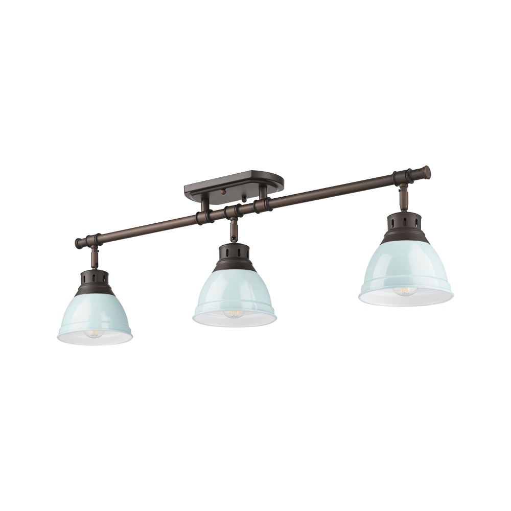 Bring timeless farmhouse elegance into your home with the Yep by Golden Lighting Duncan 3-light Semi-Flush Mount. Featuring a metal shade and a Rubbed Bronze frame, it creates a welcoming atmosphere. This metal shade features a Seafoam finish with a light, pastel blue-green hue, showcasing a smooth surface with a highly reflective sheen. Its calming and cheerful finish brightens kitchens and workspaces with a vintage-inspired style. The Rubbed Bronze finish adds a touch of classic warmth with its deep brown base brushed to reveal subtle highlights, complementing various styles from rustic to transitional. Ideal for homes with mid-height ceilings, it is damp location rated, suitable for areas with occasional moisture, such as bathrooms and covered porches. The adjustable directional heads allow you to customize the lighting to highlight specific areas or objects. Overall Dimensions: 35.38"W x 10.75"H x 6.5"D. Requires 3 E26 Medium base bulbs (not included) with a max wattage of 100. Elevate your living spaces with quality and style that reflects your lifestyle and taste.