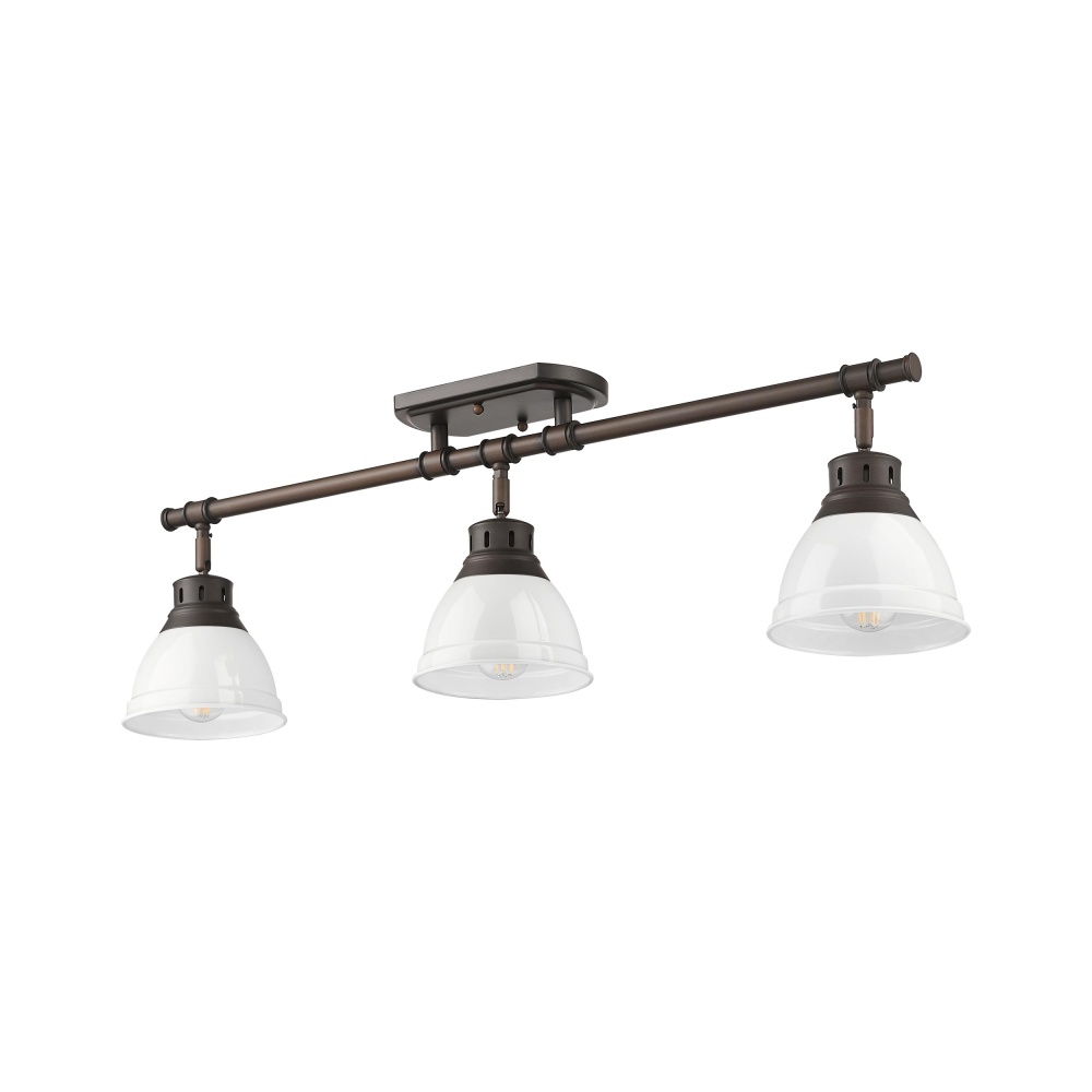 Transform your home with traditional elegance using the Yep by Golden Lighting Duncan 3-light Semi-Flush Mount. Featuring a metal shade and a Rubbed Bronze frame, it creates an inviting glow in various spaces. The metal shade showcases a crisp White finish, characterized by a smooth surface with a high-gloss sheen, providing excellent light reflection. This clean and functional design is perfect for modern farmhouse and coastal interiors, adding a bright and airy feel to your spaces. The Rubbed Bronze finish adds warmth and depth, making it a versatile choice that complements various decor styles from rustic to contemporary. This fixture is suitable for mid-height ceilings in entryways, bedrooms, and living areas. It is damp location rated, ideal for areas with occasional moisture, and features adjustable directional heads for customized lighting. Overall Dimensions: 35.38"W x 10.75"H x 6.5"D. The fixture requires 3 E26 Medium base bulbs (not included) with a maximum wattage of 100. Elevate your living environment with this blend of style and quality, perfect for any home.