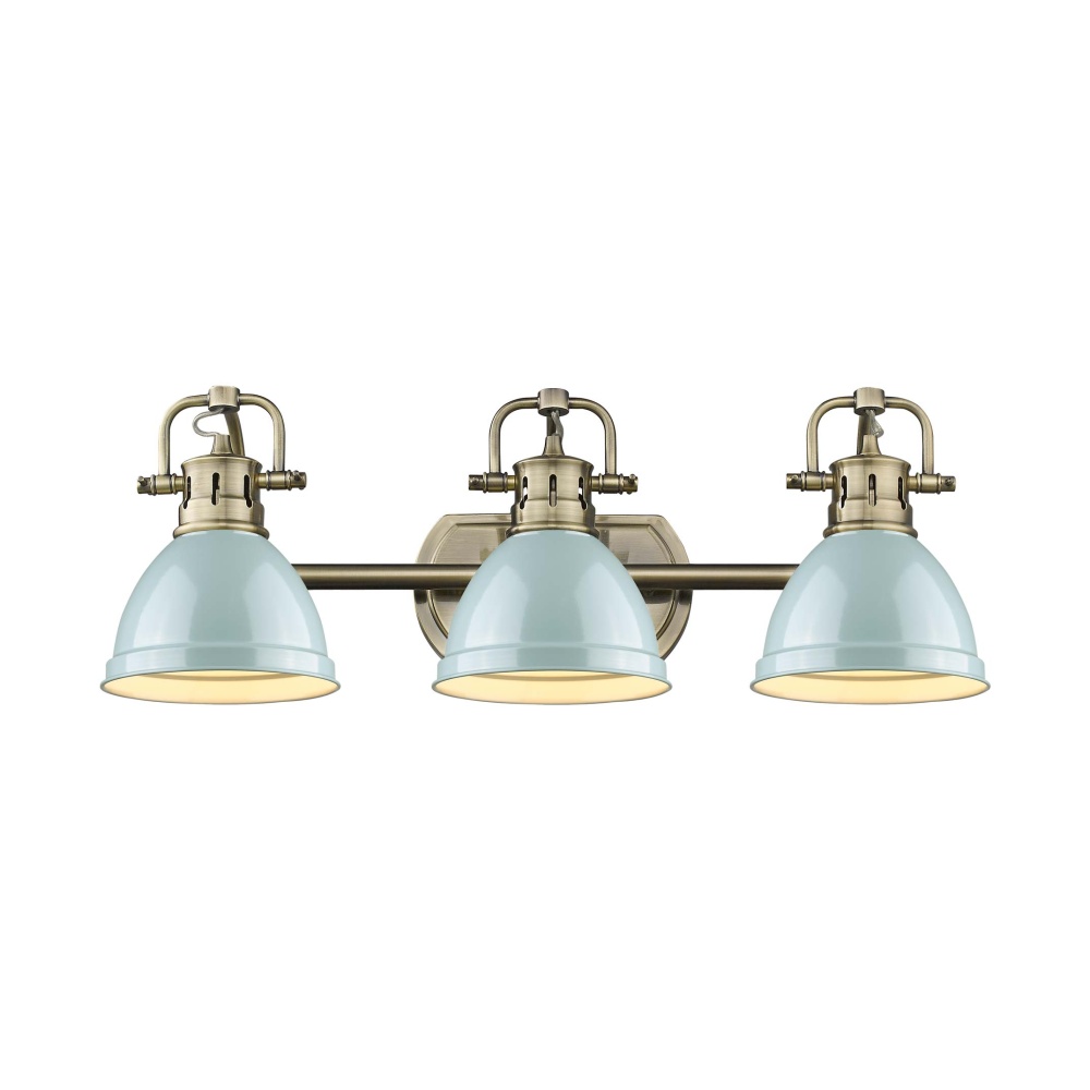 Bring seaside elegance into your home with the Yep by Golden Lighting Duncan 3-light Vanity. Featuring a Metal shade and Aged Brass frame, it creates a welcoming atmosphere. This fixture showcases the Seafoam shade, which is a soft, pastel blue-green color polished to a high-gloss sheen, reminiscent of tranquil coastal vibes. The Aged Brass finish emits a warm, inviting glow, idea for a variety of decors from industrial to transitional. Crafted through a durable electroplating process, it captures light beautifully while delivering vintage charm. Created for use in bathrooms or similar spaces, it is Damp Location Rated, making it perfect for places with occasional moisture. The Adjustable Directional Heads allow you to customize the lighting by pivoting the individual heads to highlight specific areas or objects. Overall Dimensions: 24.5"W x 8.5"H x 8.25"D. Requires 3 E26 Medium base bulbs (not included), max 100 wattage per bulb. Elevate your daily routines with this versatile light fixture, perfectly blending functionality with coastal flair.