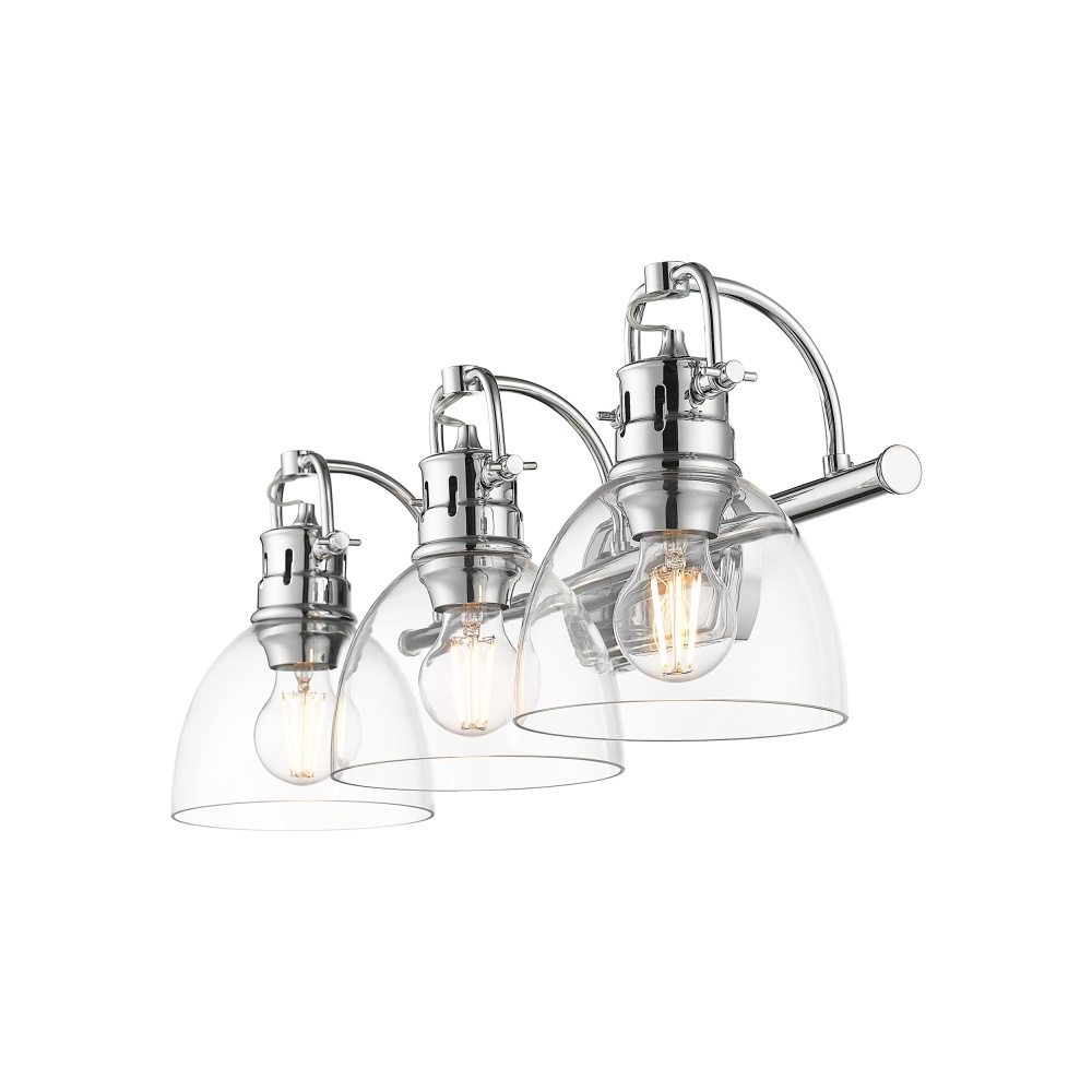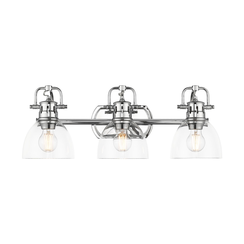 Bring farmhouse elegance into your home with the Yep by Golden Lighting Duncan 3-light Vanity. Featuring a metal shade and a chrome frame, it creates a welcoming atmosphere. This vanity light utilizes a metal shade that beautifully complements the fixture's design, providing a polished and glossy effect that enhances any space. The brilliant and timeless polished chrome finish offers a crisp, clean look that elevates any décor, while its durable electroplating process ensures easy maintenance. Perfect for brightening up bathrooms, this light is damp location rated, making it suitable for areas with occasional moisture like bathrooms and laundry rooms. The adjustable directional heads allow you to customize the lighting to highlight specific areas. Overall Dimensions: 24.5"W x 8.5"H x 8.25"D. Requires 3 E26 Medium base bulbs (not included) with a maximum wattage of 100 per bulb. Enjoy quality craftsmanship and timeless design with this beautiful lighting solution that adds charm and functionality to your home.