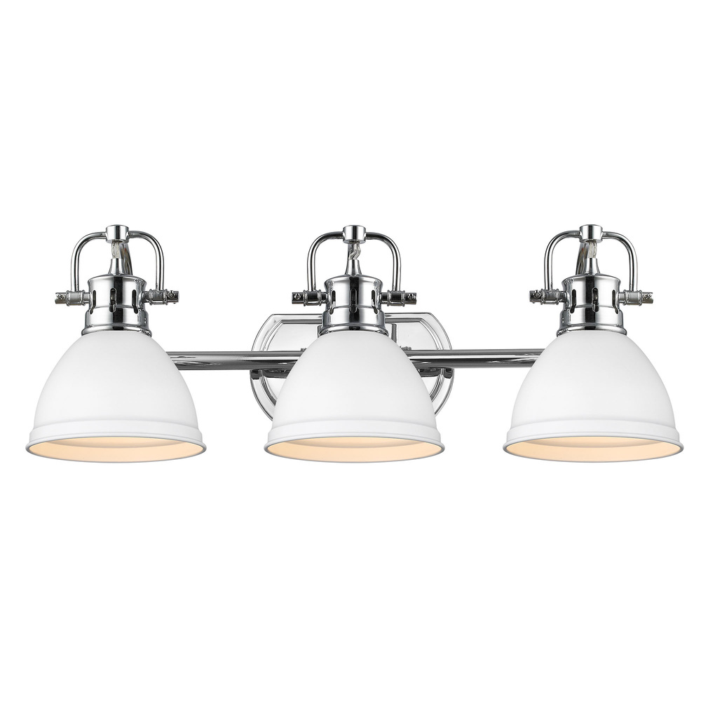 Introducing the Yep by Golden Lighting Duncan 3-light Vanity, a perfect blend of classic charm and modern minimalism. Featuring a metal shade with a matte white finish and a polished chrome frame, this fixture creates a stylish ambiance. The matte white metal shade presents an effortlessly clean and contemporary look. Its smooth surface absorbs light beautifully, enhancing the overall aesthetic of your space. The polished chrome finish adds a touch of luxury while being easy to maintain, ensuring a sleek look that complements any decor style—even from modern to traditional. Ideal for bathrooms, this fixture is Damp Location Rated, making it suitable for areas with occasional moisture like bathrooms and laundry rooms. The adjustable directional heads allow you to customize the lighting to spotlight areas or tasks as desired. Overall Dimensions: 24.5"W x 8.5"H x 8.25"D. Requires 3 E26 Medium base bulbs (not included), max 100 wattage per bulb. Transform your space with the quality and timeless elegance of Yep by Golden Lighting.