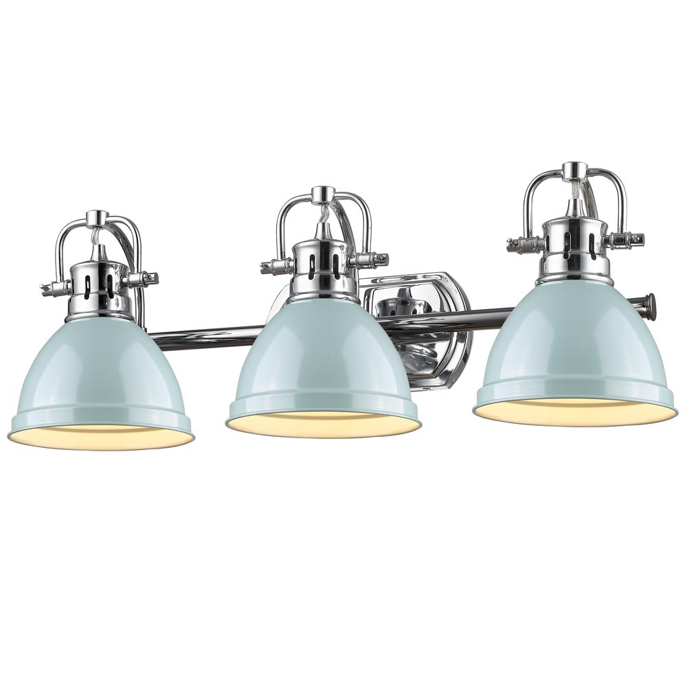 Bring rustic elegance into your home with the Yep by Golden Lighting Duncan 3-light Vanity. Featuring a metal shade and a polished chrome frame, it creates a welcoming atmosphere. The metal shade features a delightful seafoam finish that adds a breezy coastal charm while its smooth, reflective surface enhances the light's glow. Brilliant and timeless, the polished chrome finish offers a crisp, clean look that elevates any space, seamlessly integrating into a wide range of decor styles from modern to classic. Perfect for brightening up bathrooms with dedicated lighting that flatters while providing practical task illumination. Damp Location Rated, suitable for covered and semi-enclosed spaces with occasional moisture, like bathrooms and covered porches. Customize your lighting experience with adjustable directional heads to highlight specific areas. Overall Dimensions: 24.5"W x 8.5"H x 8.25"D. Requires 3 E26 Medium base bulbs (not included), max 100 wattage per bulb. Elevate your space with the timeless style and quality of the Yep by Golden Lighting.