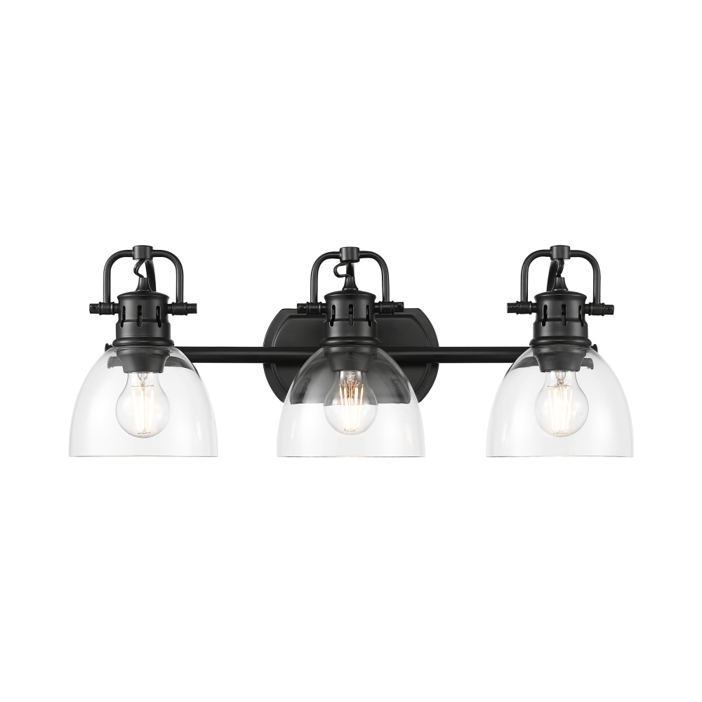 Bring farmhouse elegance into your home with the Yep by Golden Lighting Duncan 3-light Vanity. Featuring a Clear Glass shade and a Matte Black frame, it creates a welcoming atmosphere. This Clear Glass shade is polished to a high-gloss shine, allowing brilliant, unobstructed light to shine through. The transparent design pairs beautifully with the timeless Matte Black finish, highlighting the fixture's simplicity and sophistication. Brighten up bathrooms with dedicated lighting that flatters while providing practical task illumination. Rated for damp locations, this fixture is suitable for covered and semi-enclosed spaces with occasional moisture. The adjustable directional heads allow you to customize the lighting to highlight specific areas. Overall Dimensions: 24.5"W x 8.5"H x 8.25"D, and requires 3 E26 Medium base bulbs (not included), with a maximum wattage of 100 per bulb. Enhance your space with the quality craftsmanship of Yep by Golden Lighting, adding both style and function to your bathroom decor.