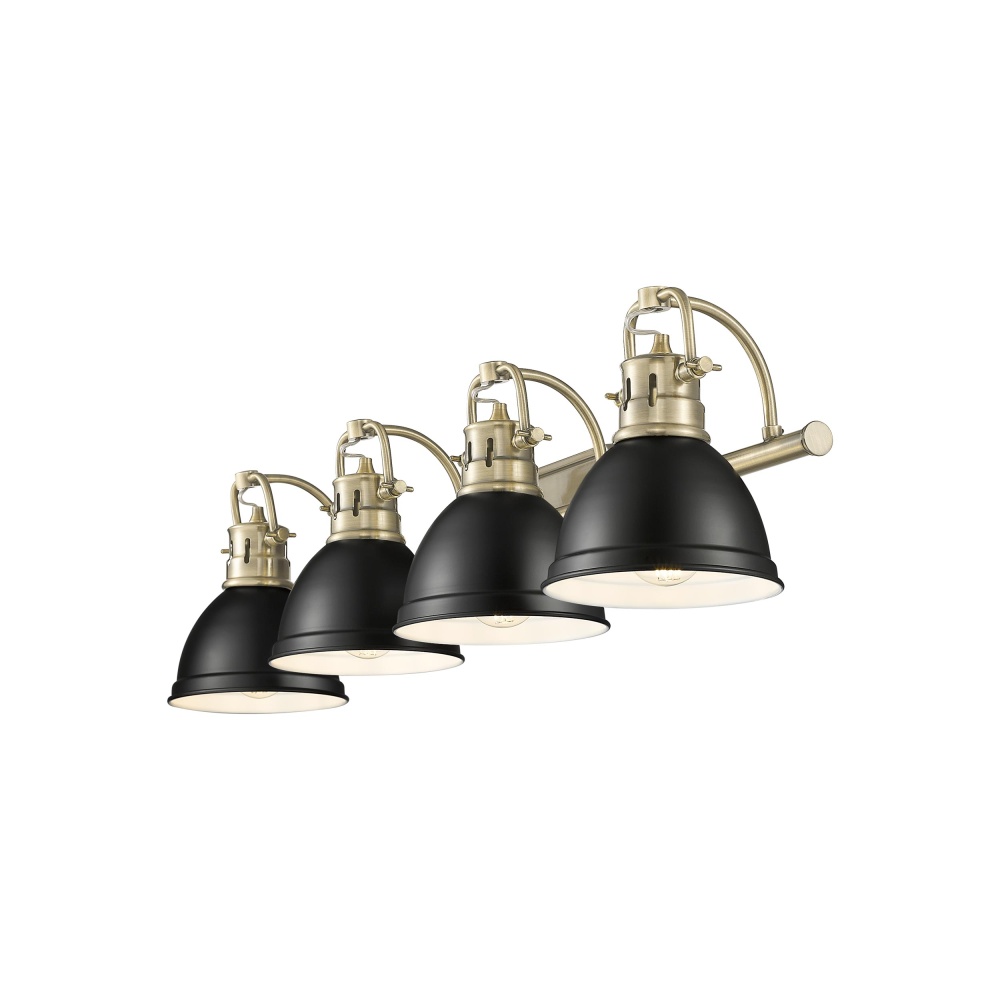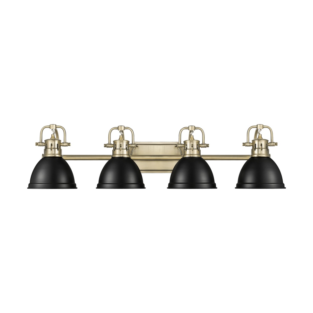Bring timeless farmhouse elegance into your home with the Yep by Golden Lighting Duncan 4-light Vanity. Featuring a metal shade and an Aged Brass frame, it creates a welcoming atmosphere. The metal shade offers classic simplicity, highlighted by a matte black finish that absorbs light, crafting a sophisticated look. Embrace the warm, inviting glow of the Aged Brass finish which enhances any traditional or transitional decor, reminiscent of vintage heirlooms and classic hardware. Brighten up bathrooms with dedicated lighting that flatters while providing practical task illumination, it’s rated for damp locations, perfect for covered spaces. Adjustable directional heads let you customize lighting to highlight specific areas. Overall dimensions are 33.5"W x 8.5"H x 8.25"D and it requires 4 E26 medium base bulbs (not included), max 100 wattage per bulb. Elevate your bathroom with this classic fusion of style and functionality by Yep by Golden Lighting.