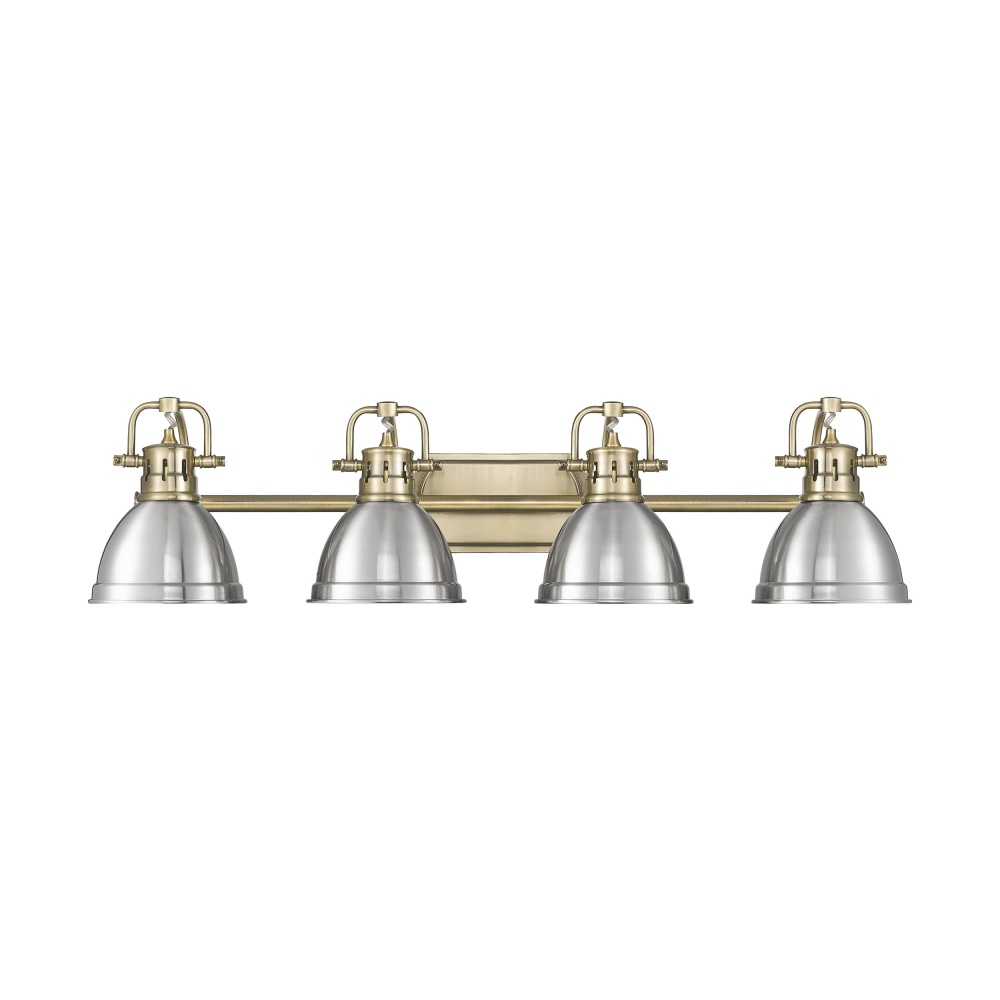 Bring timeless charm into your home with the Yep by Golden Lighting Duncan 4-light Vanity. This fixture features a metal shade and a sophisticated aged brass frame, establishing a cozy atmosphere. The pewter metal shade presents a warm silver-grey color with a satin lustre, gently diffusing soft light. The aged brass finish, reminiscent of vintage heirlooms, adds character and warmth to your space. Ideal for bathrooms and damp locations, this piece ensures illuminating function and beauty, with adjustable directional heads for custom lighting. Overall dimensions: 33.5"W x 8.5"H x 8.25"D. Requires 4 E26 Medium base bulbs (not included), with a maximum of 100 watts each. Elevate your bathroom with this stylish and quality fixture.