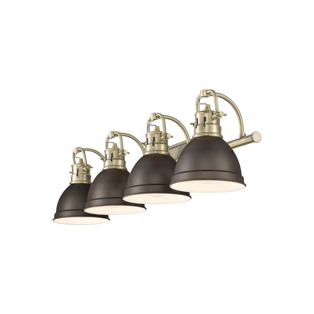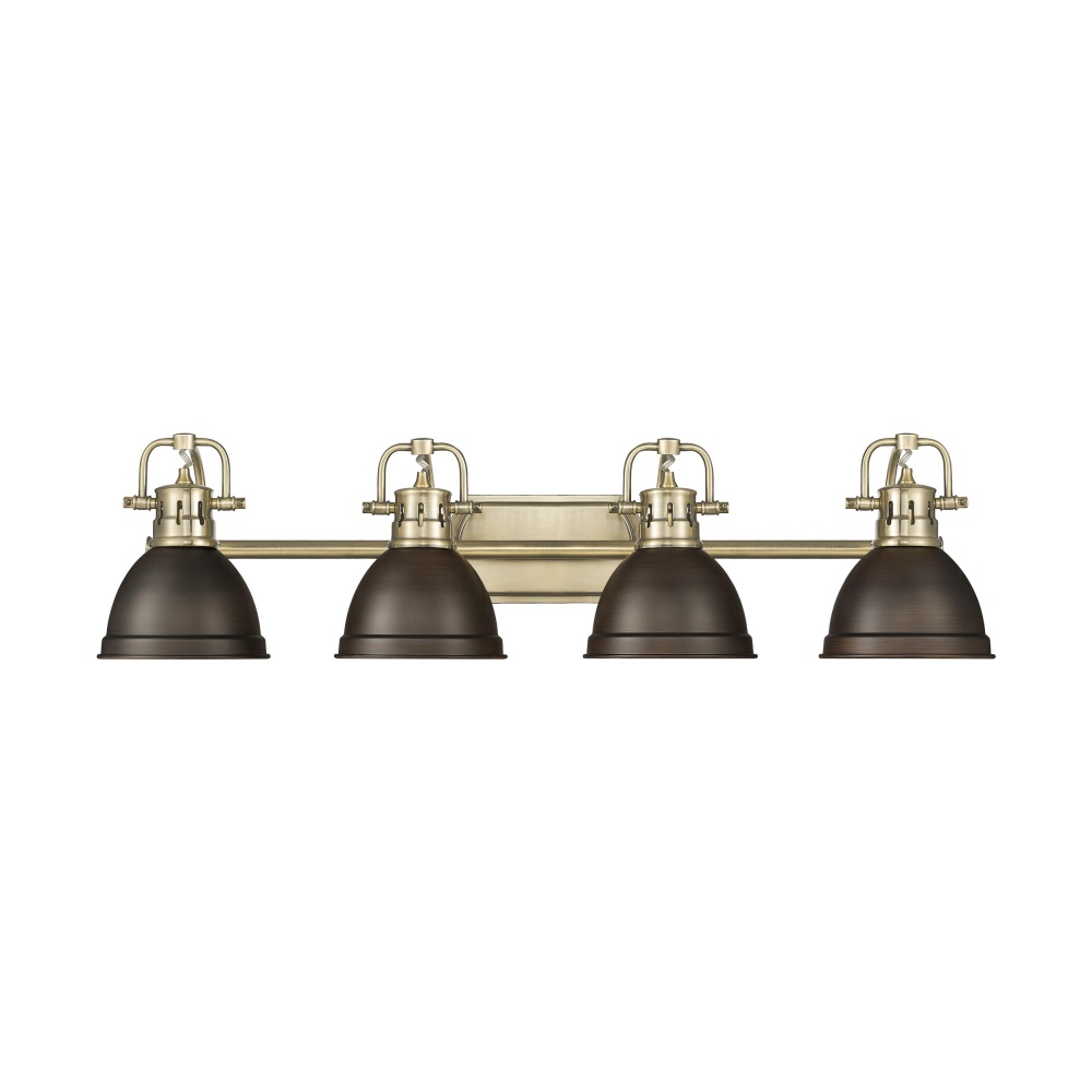 Embrace timeless charm in your home with the Yep by Golden Lighting Duncan 4-light Vanity. Featuring a metal shade and an elegant aged brass frame, it creates a welcoming ambience. The rubbed bronze metal shade offers a rich, dark brown hue with subtle coppery highlights, enhancing the light diffusion. The aged brass finish adds vintage elegance and a warm glow to any décor. Perfect for bathrooms, this fixture is damp location rated and comes with adjustable directional heads for highlighting specific areas. Overall dimensions are 33.5"W x 8.5"H x 8.25"D, requiring 4 E26 Medium base bulbs (not included) with a maximum wattage of 100 watts per bulb. Transform your space with this stylish and sophisticated lighting solution.