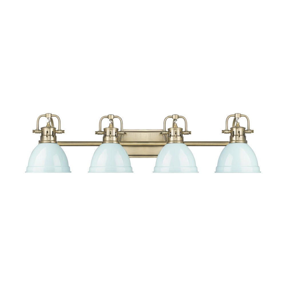 Bring traditional elegance into your home with the Yep by Golden Lighting Duncan 4-light Vanity. Featuring a metal shade and an aged brass frame, it creates a welcoming atmosphere. The metal shade features a seafoam finish that showcases a light, pastel blue-green color, smooth texture, and a high-gloss sheen, evoking breezy coastal charm. Embrace timeless elegance with our Aged Brass finish. This sophisticated finish offers a warm, inviting glow, reminiscent of vintage heirlooms and classic hardware. This vanity light is perfect for brightening up bathrooms with dedicated lighting that flatters while providing practical task illumination. It's damp location rated, suitable for covered and semi-enclosed spaces with occasional moisture. The adjustable directional heads allow you to customize the lighting to highlight specific areas, providing flexibility in illuminating your space. Overall Dimensions: 33.5"W x 8.5"H x 8.25"D. Requires 4 E26 Medium base bulbs (not included), with a maximum of 100 wattage per bulb. Close with the confidence of quality design and timeless style, ensuring your space radiates warmth and charm.