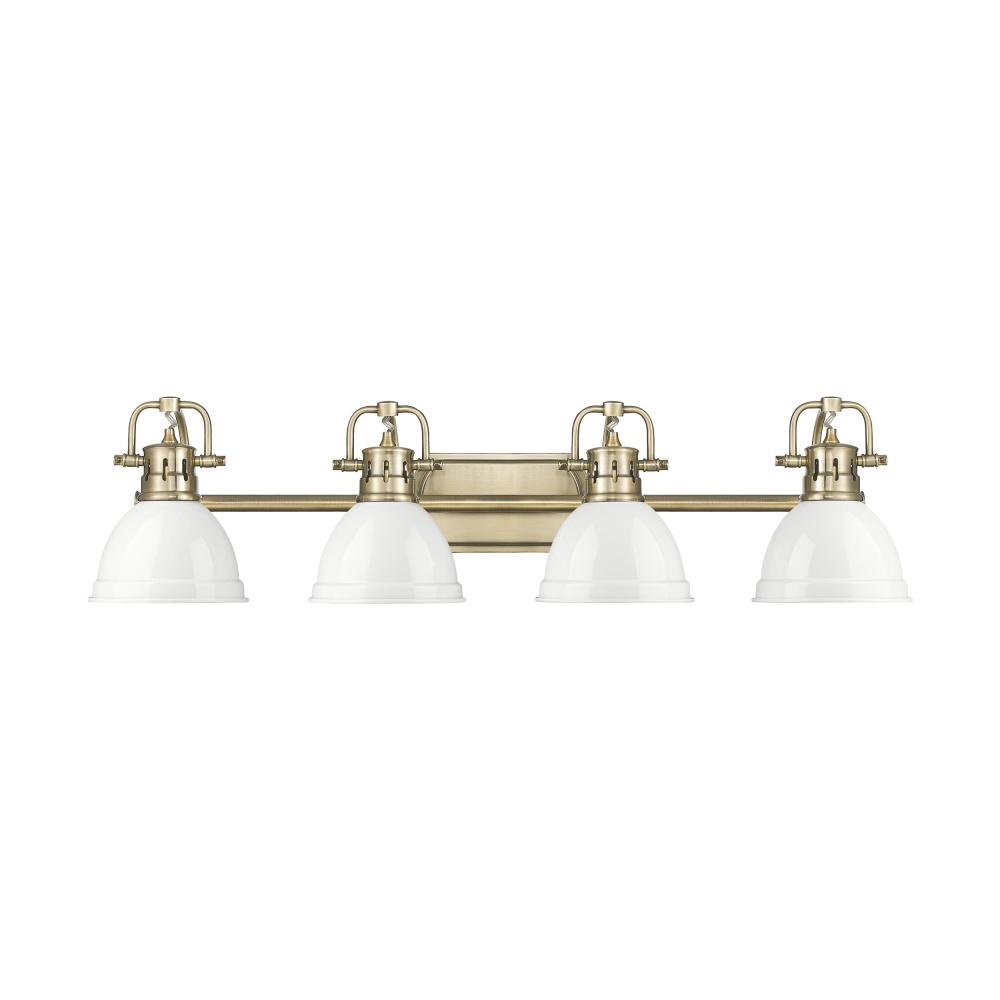Bring traditional elegance into your home with the Yep by Golden Lighting Duncan 4-light Vanity. Featuring a metal shade and an aged brass frame, it creates a welcoming atmosphere. The metal shade features a white finish that showcases a solid bright white color, smooth texture, and a high-gloss sheen, epitomizing timeless utility style. Embrace timeless elegance with our Aged Brass finish. This sophisticated finish offers a warm, inviting glow, reminiscent of vintage heirlooms and classic hardware. This vanity light is perfect for brightening up bathrooms with dedicated lighting that flatters while providing practical task illumination. It's damp location rated, suitable for covered and semi-enclosed spaces with occasional moisture. The adjustable directional heads allow you to customize the lighting to highlight specific areas, providing flexibility in illuminating your space. Overall Dimensions: 33.5"W x 8.5"H x 8.25"D. Requires 4 E26 Medium base bulbs (not included), with a maximum of 100 wattage per bulb. Close with the confidence of quality design and timeless style, ensuring your space radiates warmth and charm.