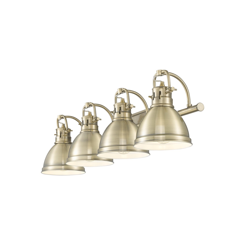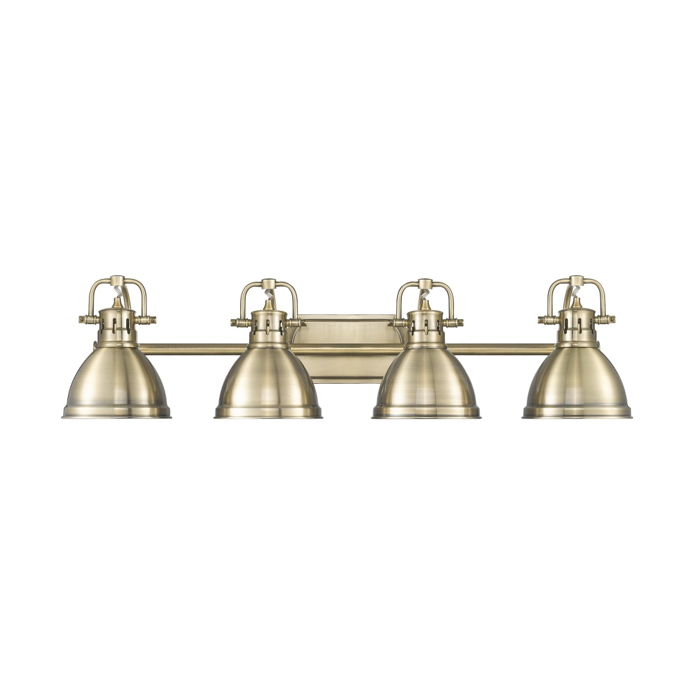 Embrace timeless sophistication with the Yep by Golden Lighting Duncan 4-light Vanity. Featuring a metal shade and an aged brass frame, it creates a welcoming atmosphere. The metal shade showcases an aged brass finish, characterized by a warm, antiqued gold base adorned with a low-luster satin sheen. This texture beautifully catches and diffuses light, radiating warmth throughout any space. The aged brass finish adds depth reminiscent of vintage heirlooms, enhancing the fixture's character and style, making it ideal for traditional, transitional, or industrial-inspired interiors. Brighten up bathrooms with dedicated lighting that flatters while providing practical task illumination. This vanity light is damp location rated, suitable for covered and semi-enclosed areas that may experience occasional moisture. The adjustable directional heads allow you to customize the lighting to focus on specific areas or objects. Overall Dimensions: 33.5"W x 8.5"H x 8.25"D. Requires 4 E26 Medium base bulbs (not included), with a maximum wattage of 100 per bulb. Enhance your bathroom’s aesthetic with this quality fixture that combines functional style with lasting appeal.