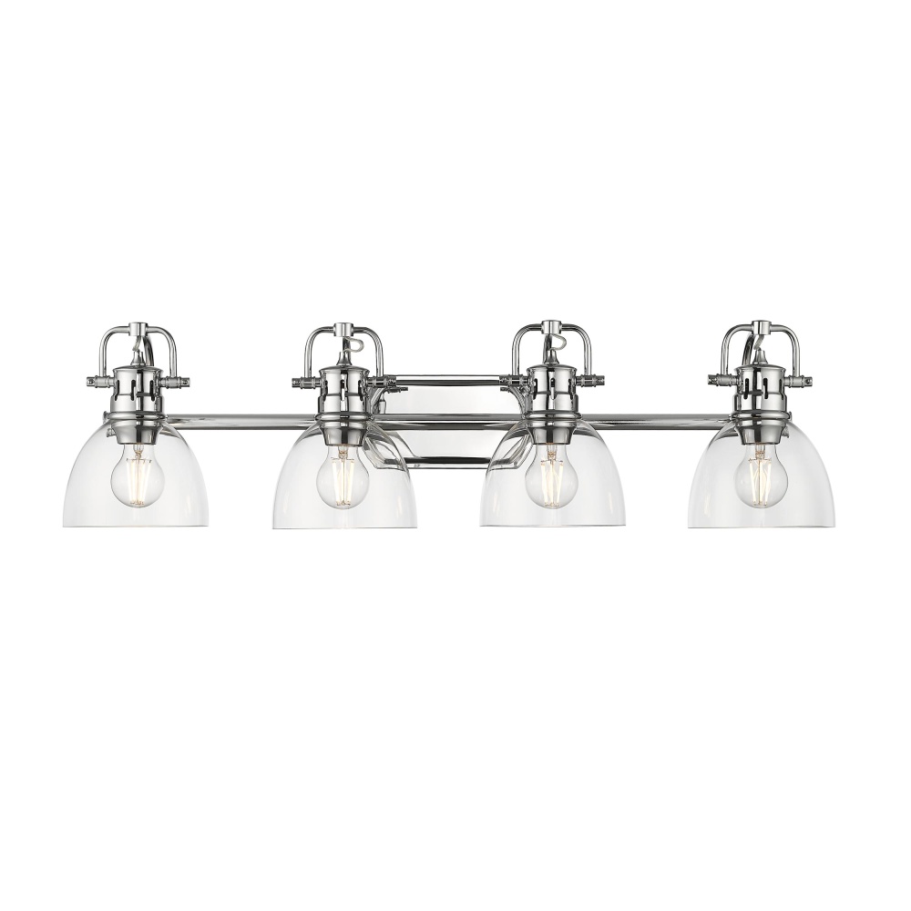 Incorporate a touch of elegance into your space with the Yep by Golden Lighting Duncan 4-light Vanity in Chrome and Clear Glass. Featuring a clear glass shade and a chrome frame, it creates a welcoming atmosphere. The clear glass shade showcases unobstructed light for a brilliant glow, making it perfect for illuminating your bathroom with clarity. The polished chrome finish provides a high-shine sheen that is both sleek and versatile, seamlessly fitting various decor styles. This versatile vanity light is damp location rated, suitable for bathrooms, covered porches, and laundry rooms. Its adjustable directional heads allow you to customize the lighting, overall dimensions are 33.5"W x 8.5"H x 8.25"D, requiring 4 E26 Medium base bulbs (not included), with a maximum wattage of 100 per bulb. Elevate your home's aesthetics with this beautifully crafted lighting solution that combines functionality and style.