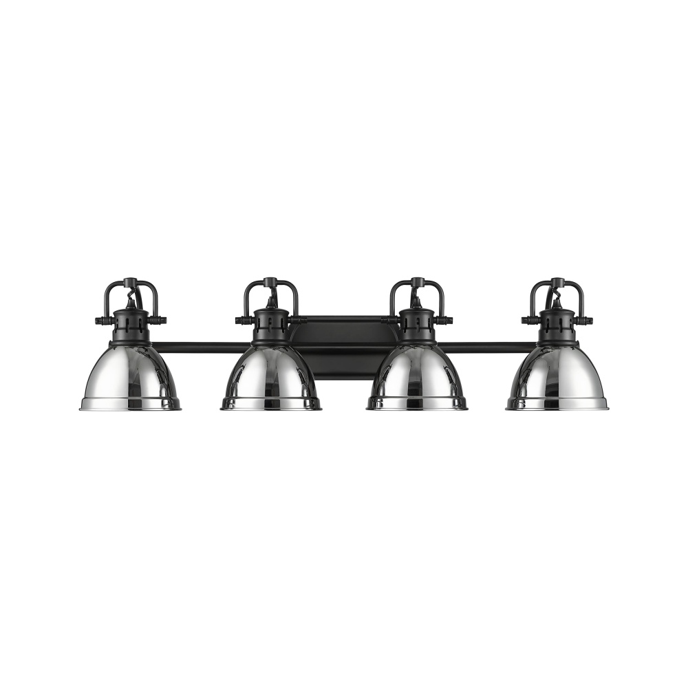 Bring timeless charm into your home with the Yep by Golden Lighting Duncan 4-light Vanity. Featuring a chrome shade and a matte black frame, it creates a welcoming atmosphere. The chrome shade features a polished chrome finish, reflecting light brilliantly and enhancing your decor with its clean lines and modern touch. The epitome of clean, modern style, the matte black finish is smooth to the touch and versatile, complementing a variety of interior designs. Brighten up bathrooms with dedicated lighting that flatters while providing practical task illumination. Rated for damp locations, it is suitable for covered and semi-enclosed spaces with occasional moisture, like bathrooms and laundry rooms. The adjustable directional heads allow you to customize the lighting for specific areas, merging style with practicality. Overall Dimensions: 33.5"W x 8.5"H x 8.25"D. Requires 4 E26 Medium base bulbs (not included), with a maximum wattage of 100 per bulb. Elevate your bathroom space with quality craftsmanship and stylish illumination.