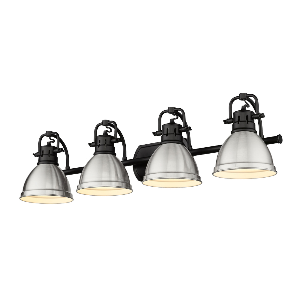 Bring traditional elegance into your home with the Yep by Golden Lighting Duncan 4-light Vanity. Featuring a metal shade and a matte black frame, it creates a welcoming atmosphere. The pewter metal shade features a warm silver-grey color with a satin lustre that gently diffuses light, offering a soft and classic aesthetic in your space. The matte black finish is timeless and versatile, providing a deep, non-reflective quality that complements various decor styles, from minimalist to contemporary. Perfect for bathrooms, this fixture is damp location rated for use in covered and semi-enclosed spaces like bathrooms and laundry rooms. With adjustable directional heads, you can customize the lighting to highlight specific areas. Overall Dimensions: 33.5"W x 8.5"H x 8.25"D. Requires 4 E26 Medium base bulbs (not included), with a maximum wattage of 100 per bulb. Enjoy quality lighting that portrays sophistication and meets your practical needs for illumination.