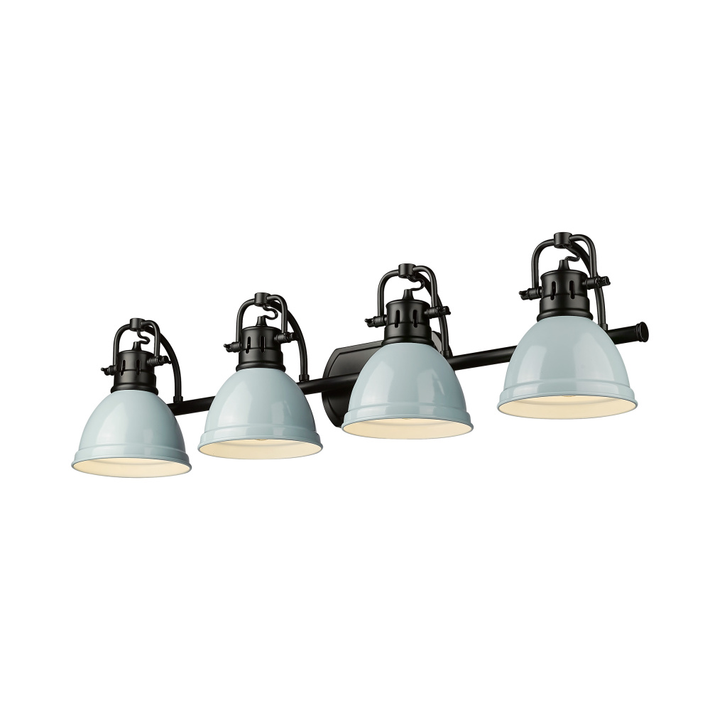 Bring traditional elegance into your home with the Yep by Golden Lighting Duncan 4-light Vanity. Featuring a Metal shade and a Matte Black frame, it creates a welcoming atmosphere. The Metal shade features a Seafoam finish that evokes coastal charm with its soft, pastel blue-green hue and high-gloss sheen. This playful color brings a refreshing touch to your space while reflecting light beautifully. Our Matte Black finish is smooth and non-reflective, designed to absorb light, providing compelling contrast against the lively color of the shade, ensuring versatility in your decor. Brighten up bathrooms with dedicated lighting that flatters while providing practical task illumination. This fixture is Damp Location Rated, suitable for covered areas with occasional moisture. It boasts adjustable directional heads for a customizable lighting experience, allowing you to direct light where it's needed most. Overall Dimensions: 33.5"W x 8.5"H x 8.25"D. Requires 4 E26 Medium base bulbs (not included, Max 100 wattage per bulb). With its quality craftsmanship and vibrant flair, this fixture is a standout choice for any bathroom.