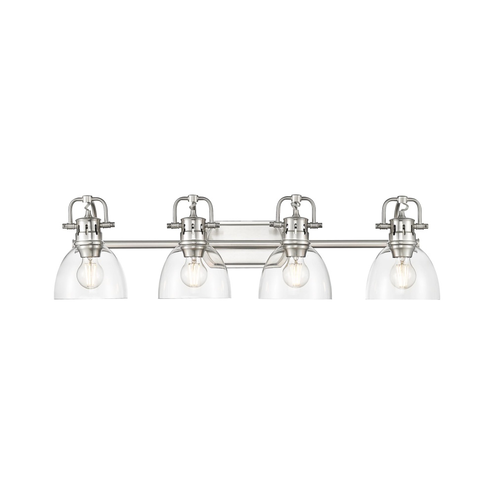 Bring farmhouse elegance into your home with the Yep by Golden Lighting Duncan 4-light Vanity. Featuring a glass shade and a pewter frame, it creates a welcoming atmosphere. The clear glass shade offers brilliant, unobstructed light, enhancing the beauty of the bulb and fixture design. The smooth, polished surface provides a high-gloss shine, making it a versatile choice for various decor styles. This pewter finish offers a soft and classic alternative to brighter silver tones. With its medium-grey hue and subtle warmth, the satin lustre gently diffuses light, creating an elegant, non-glare glow. Brighten up bathrooms with dedicated lighting that flatters while providing practical task illumination. Damp location rated, it's suitable for covered spaces with occasional moisture, like bathrooms and laundry rooms. Customize your lighting with adjustable directional heads, pivoting to highlight specific areas for maximum effect. Overall Dimensions: 33.5"W x 8.5"H x 8.25"D. Requires 4 E26 medium base bulbs (not included), max 100 wattage per bulb. Elevate your space with this timeless fixture, enhancing both classic and contemporary interiors with quality craftsmanship.