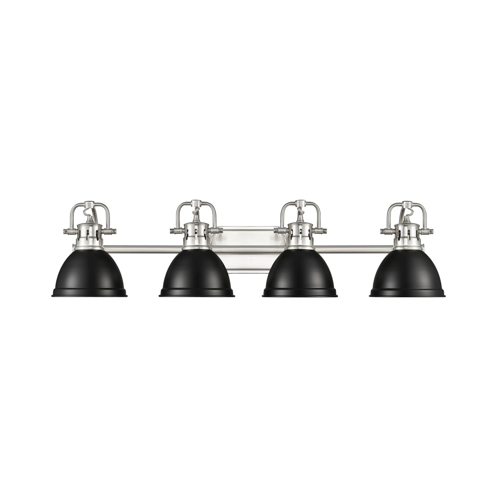 Introduce modern elegance into your home with the Yep by Golden Lighting Duncan 4-light Vanity. Featuring a metal shade and a pewter frame, it creates a welcoming atmosphere. The stylish metal shade boasts a classic matte black finish, offering a non-reflective surface that creates a sophisticated look, perfect for a contemporary bathroom setting. Our Pewter finish provides a timeless appearance with its elegant satin luster, making it an exquisite choice for classic or modern decor. Ideal for brightening up bathrooms, this fixture is rated for damp locations and includes adjustable directional heads to customize your lighting. It requires 4 E26 medium base bulbs (not included), each with a maximum wattage of 100. With overall dimensions of 33.5"W x 8.5"H x 8.25"D, it enhances your space while ensuring efficient illumination. Enjoy the blend of quality and style with this versatile vanity light.