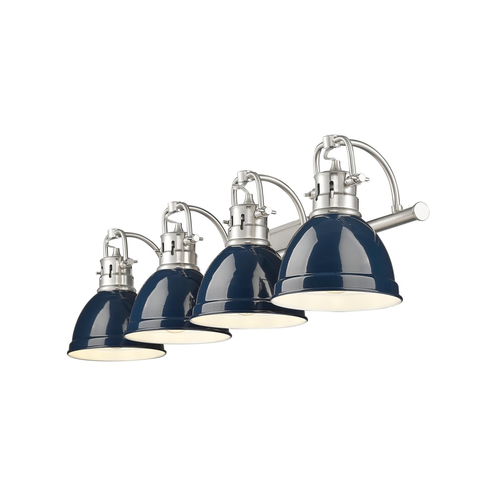 Bring farmhouse elegance into your home with the Yep by Golden Lighting Duncan 4-light Vanity. Featuring a navy blue metal shade and a pewter frame, it creates a welcoming atmosphere. The navy blue shade offers a bold pop of color, reminiscent of timeless nautical style. Its smooth, polished surface beautifully reflects its surroundings, making it a stylish choice for vibrant interiors. This pewter finish appeals with a soft, classic alternative to brighter silver tones. With its medium-grey hue and subtle warmth, the satin lustre gently diffuses light, creating an elegant, non-glare glow. Brighten up bathrooms with dedicated lighting that flatters while providing practical task illumination. Damp location rated, it's suitable for covered spaces with occasional moisture, like bathrooms and laundry rooms. Customize your lighting with adjustable directional heads, pivoting to highlight specific areas for maximum effect. Overall Dimensions: 33.5"W x 8.5"H x 8.25"D. Requires 4 E26 medium base bulbs (not included), max 100 wattage per bulb. Elevate your space with this timeless fixture, enhancing both classic and contemporary interiors with quality craftsmanship.