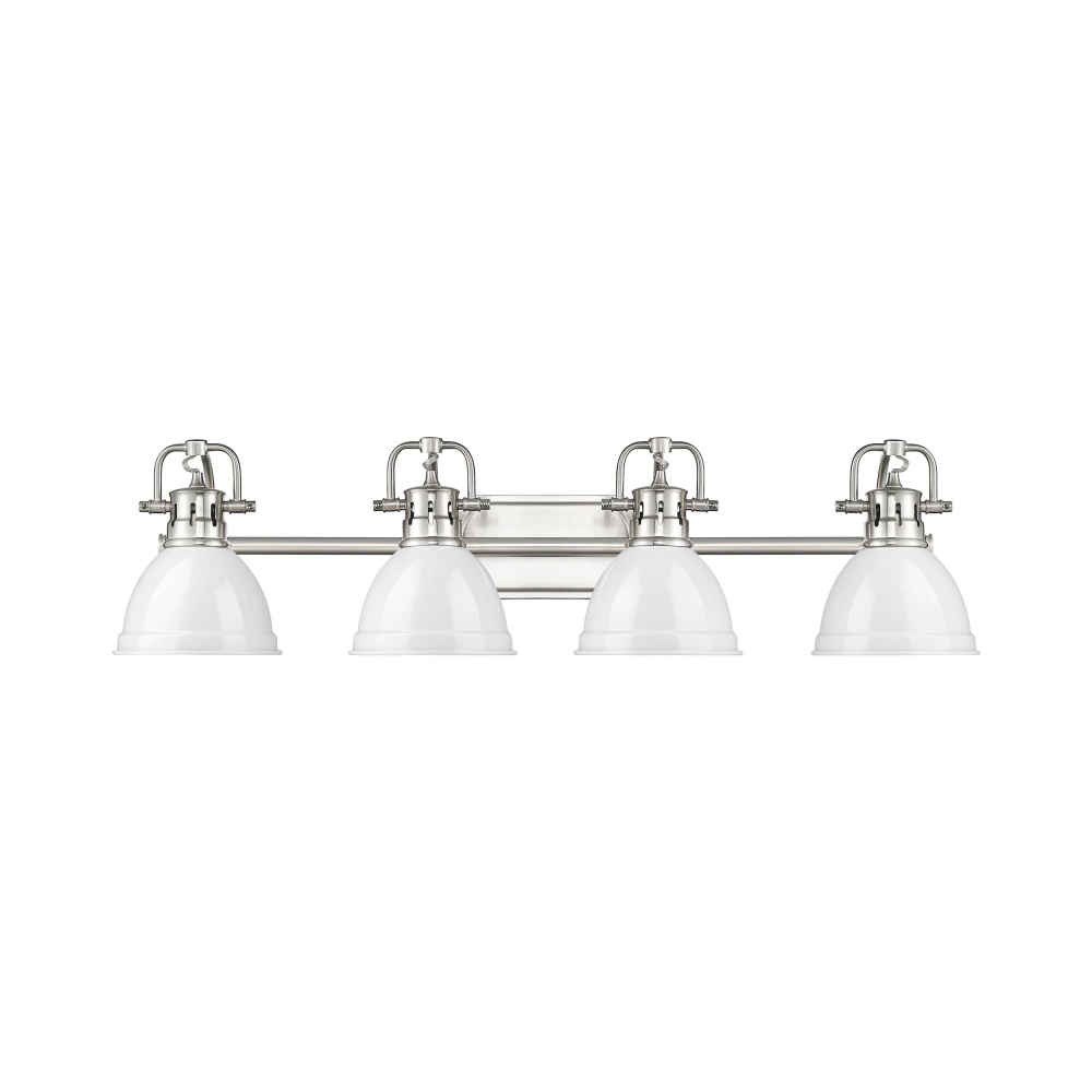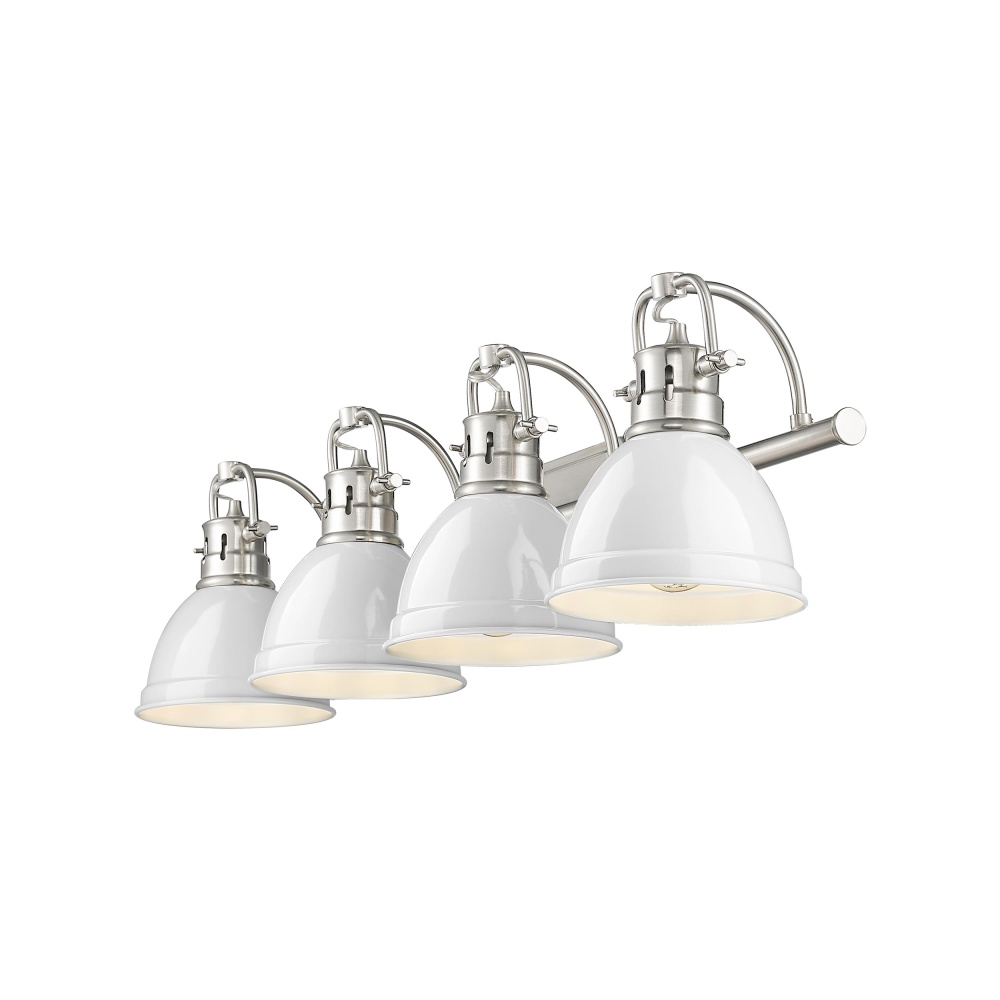 Bring farmhouse elegance into your home with the Yep by Golden Lighting Duncan 4-light Vanity. Featuring a metal shade and a pewter frame, it creates a welcoming atmosphere. The metal shade boasts a White finish that features a solid, bright white color with a highly reflective, high-gloss sheen, providing excellent light reflection. This versatile finish is perfect for modern farmhouse, coastal, and retro-inspired interiors. Our pewter finish offers an understated and timeless appeal, enhanced by a durable electroplating process. This versatile fixture brings a touch of traditional charm to any interior design style. Brighten up bathrooms with dedicated lighting that flatters while providing practical task illumination. Damp Location Rated for areas with occasional moisture, this fixture's adjustable directional heads allow you to customize the light to highlight specific areas. Overall Dimensions: 33.5"W x 8.5"H x 8.25"D, requiring 4 E26 Medium base bulbs (not included, max 100 wattage per bulb). Close your space with lifestyle appeal and quality from Yep by Golden Lighting.