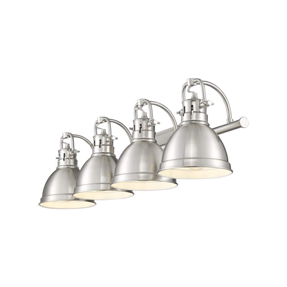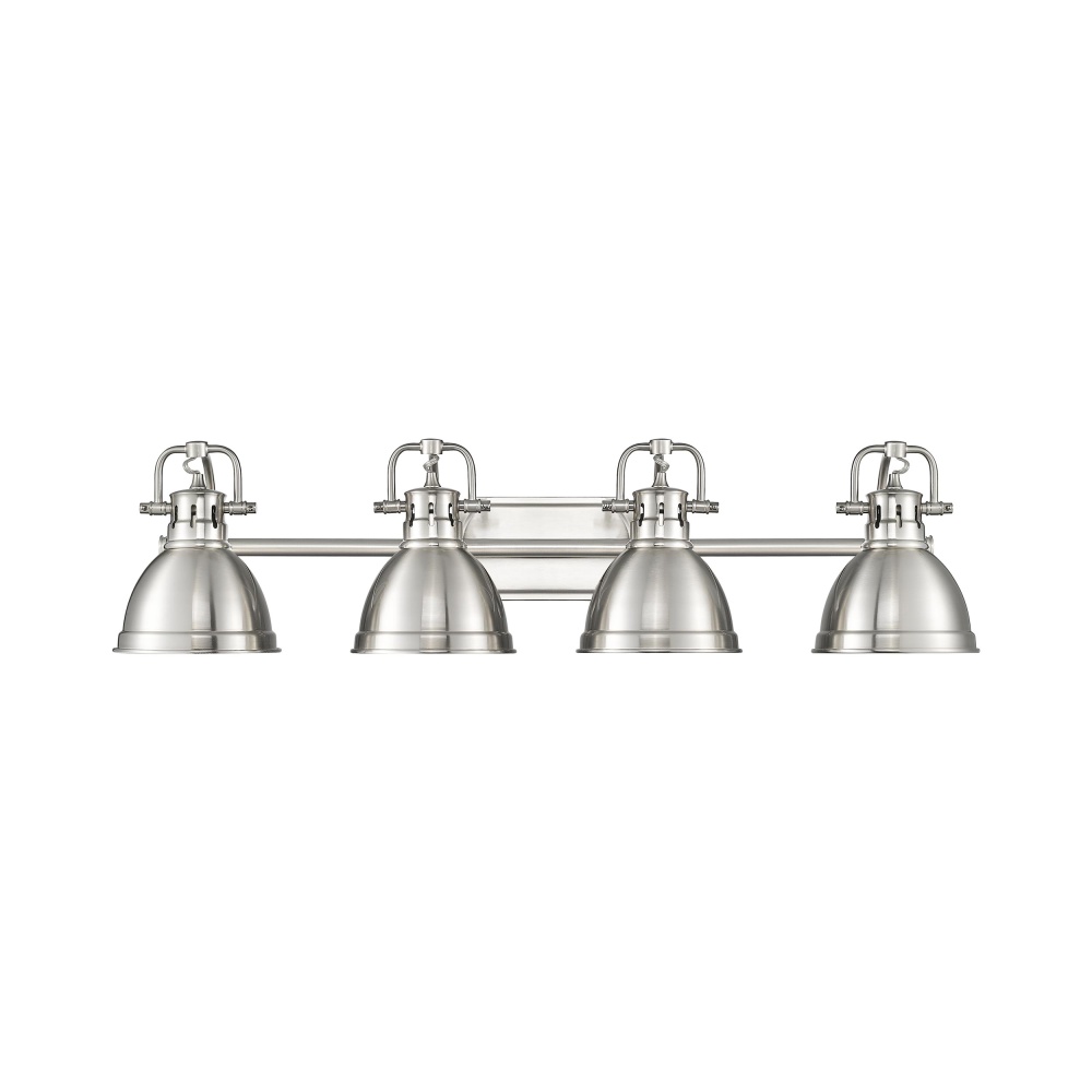 Bring farmhouse elegance into your home with the Yep by Golden Lighting Duncan 4-light Vanity. Featuring a pewter metal shade and a pewter frame, it creates a welcoming atmosphere. The pewter shade showcases a medium-toned, warm silver-grey color, providing a uniform satin lustre. This texture gently diffuses light, enhancing the glow and adding sophistication to any space. Our pewter finish offers a soft and classic alternative to brighter silver tones. With its medium-grey hue and subtle warmth, it adds an understated and timeless appeal, perfect for both classic and contemporary interiors. Brighten up bathrooms with dedicated lighting that flatters while providing practical task illumination. Damp location rated, it's suitable for covered spaces with occasional moisture, like bathrooms and laundry rooms. Customize your lighting with adjustable directional heads, pivoting to highlight specific areas for maximum effect. Overall Dimensions: 33.5"W x 8.5"H x 8.25"D. Requires 4 E26 medium base bulbs (not included), max 100 wattage per bulb. Elevate your space with this timeless fixture, enhancing both classic and contemporary interiors with quality craftsmanship.