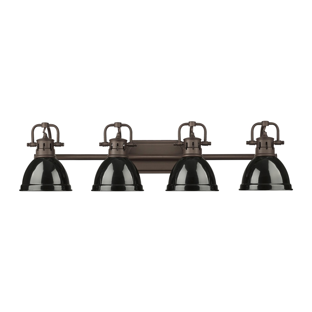 Bring farmhouse elegance into your home with the Yep by Golden Lighting Duncan 4-light Vanity. Featuring a black metal shade and a Rubbed Bronze frame, it creates a welcoming atmosphere. The luxurious Glossy Black finish on the shades adds a bold, modern touch while beautifully reflecting light in the room. Our Rubbed Bronze finish delivers a classic warmth, showcasing a deep brown base with subtle highlights for versatile style. Perfect for brightening up bathrooms, this fixture is Damp Location Rated for covered and semi-enclosed spaces, such as laundry rooms and covered porches. Installation is simple with adjustable directional heads designed to highlight specific areas. With dimensions of 33.5"W x 8.5"H x 8.25"D and requiring 4 E26 Medium base bulbs (not included), max wattage 100 per bulb, it balances functionality with aesthetic appeal. Elevate your bathroom with this stylish blend of tradition and modernity, ensuring quality and character.