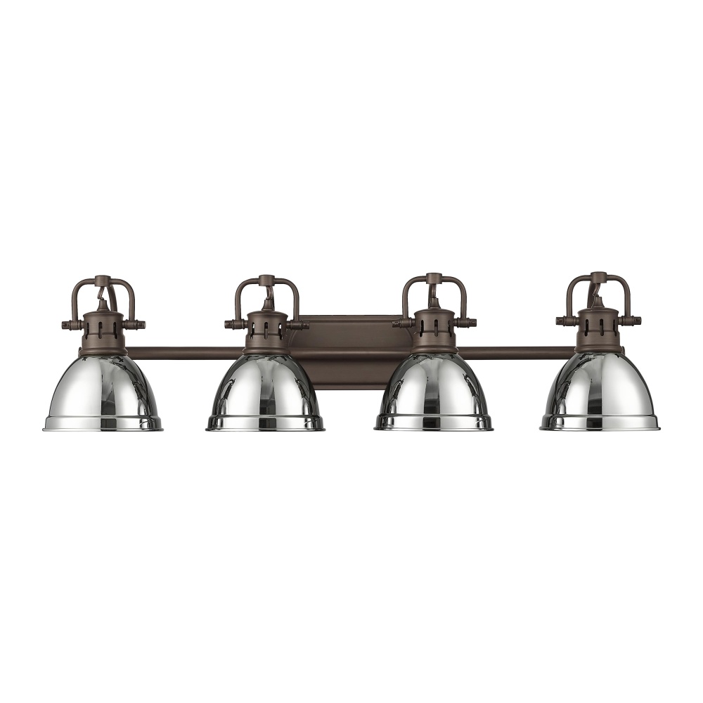 Bring farmhouse elegance into your home with the Yep by Golden Lighting Duncan 4-light Vanity. Featuring a metal shade and a rubbed bronze frame, it creates a warm and inviting atmosphere. The metal shade offers a polished chrome finish that features a bright, cool-toned silver color with a mirror-like sheen, providing brilliant and unobstructed light. A timeless and versatile choice, the rubbed bronze finish brings a touch of classic warmth to any design, complementing various styles from traditional to industrial. Brighten up bathrooms with dedicated lighting that flatters while ensuring safety in damp locations. The adjustable directional heads allow you to customize the lighting to highlight specific areas, while the design is suitable for covered and semi-enclosed spaces. Overall Dimensions: 33.5"W x 8.5"H x 8.25"D. Requires 4 E26 Medium base bulbs (not included), with a maximum of 100 wattage per bulb. Elevate your bathroom with this quality fixture that combines functionality with stylish appeal.