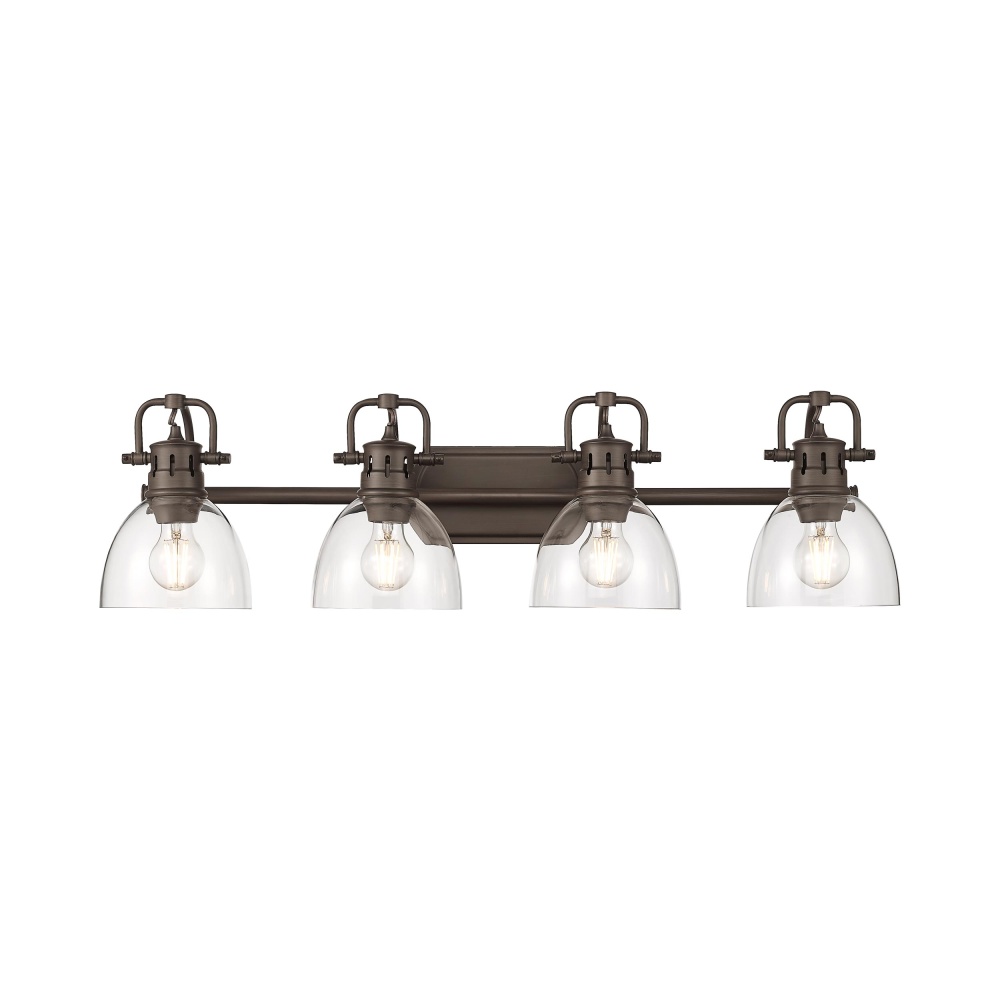 Bring farmhouse elegance into your home with the Yep by Golden Lighting Duncan 4-light Vanity. Featuring a clear glass shade and a rubbed bronze frame, it creates an inviting atmosphere. The clear glass shade perfectly showcases the bulbs, offering unobstructed light that enhances any space with its high-gloss shine. With a timeless rubbed bronze finish that provides classic warmth, this fixture complements various designs from traditional farmhouse to contemporary. Brighten up bathrooms with dedicated lighting that flatters, while ensuring safety in damp locations. The adjustable directional heads allow you to customize the lighting for optimal task illumination in covered or semi-enclosed spaces. Overall Dimensions: 33.5"W x 8.5"H x 8.25"D. Requires 4 E26 Medium base bulbs (not included), with a maximum of 100 wattage per bulb. Elevate your bathroom with this quality fixture that combines functionality and classic style.