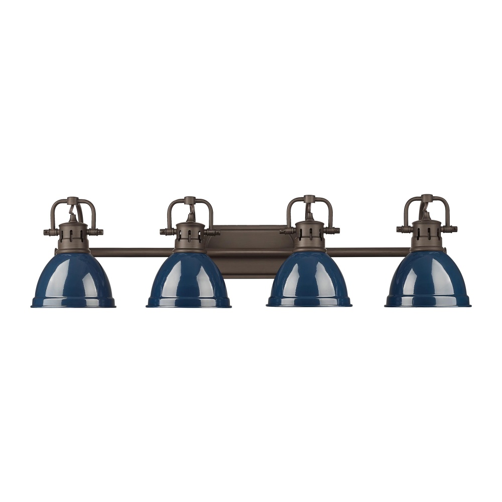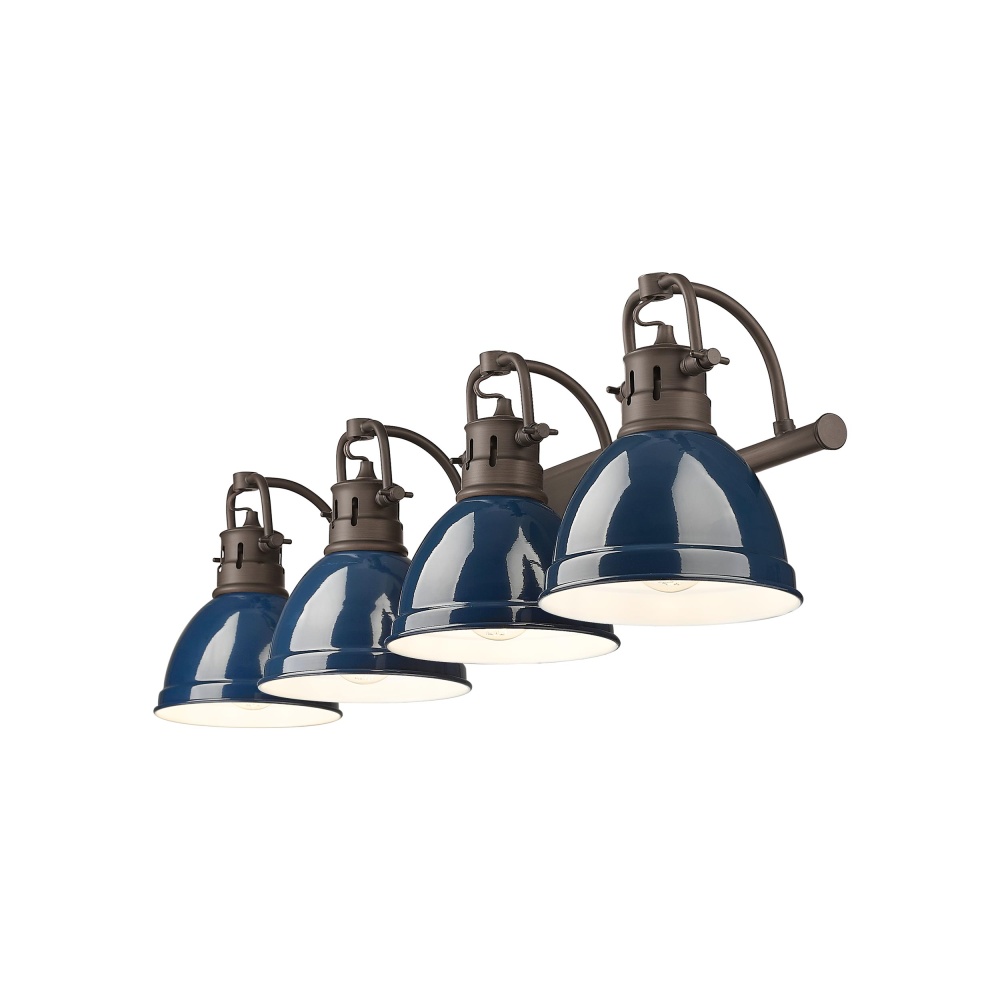 Bring farmhouse elegance into your home with the Yep by Golden Lighting Duncan 4-light Vanity. Featuring a navy blue metal shade and a rubbed bronze frame, it creates a bold yet inviting atmosphere. The metal shade offers a reflective navy blue finish that adds color and sophistication, providing warm illumination in style. A timeless rubbed bronze finish delivers classic warmth, this fixture beautifully complements various styles from traditional farmhouse to modern designs. Enhance your bathroom with dedicated lighting that flatters while ensuring safety in damp locations. The adjustable directional heads allow you to customize the lighting for specific areas in covered or semi-enclosed spaces. Overall Dimensions: 33.5"W x 8.5"H x 8.25"D. Requires 4 E26 Medium base bulbs (not included), with a maximum of 100 wattage per bulb. Elevate your bathroom with a quality fixture that fuses functionality and striking design.