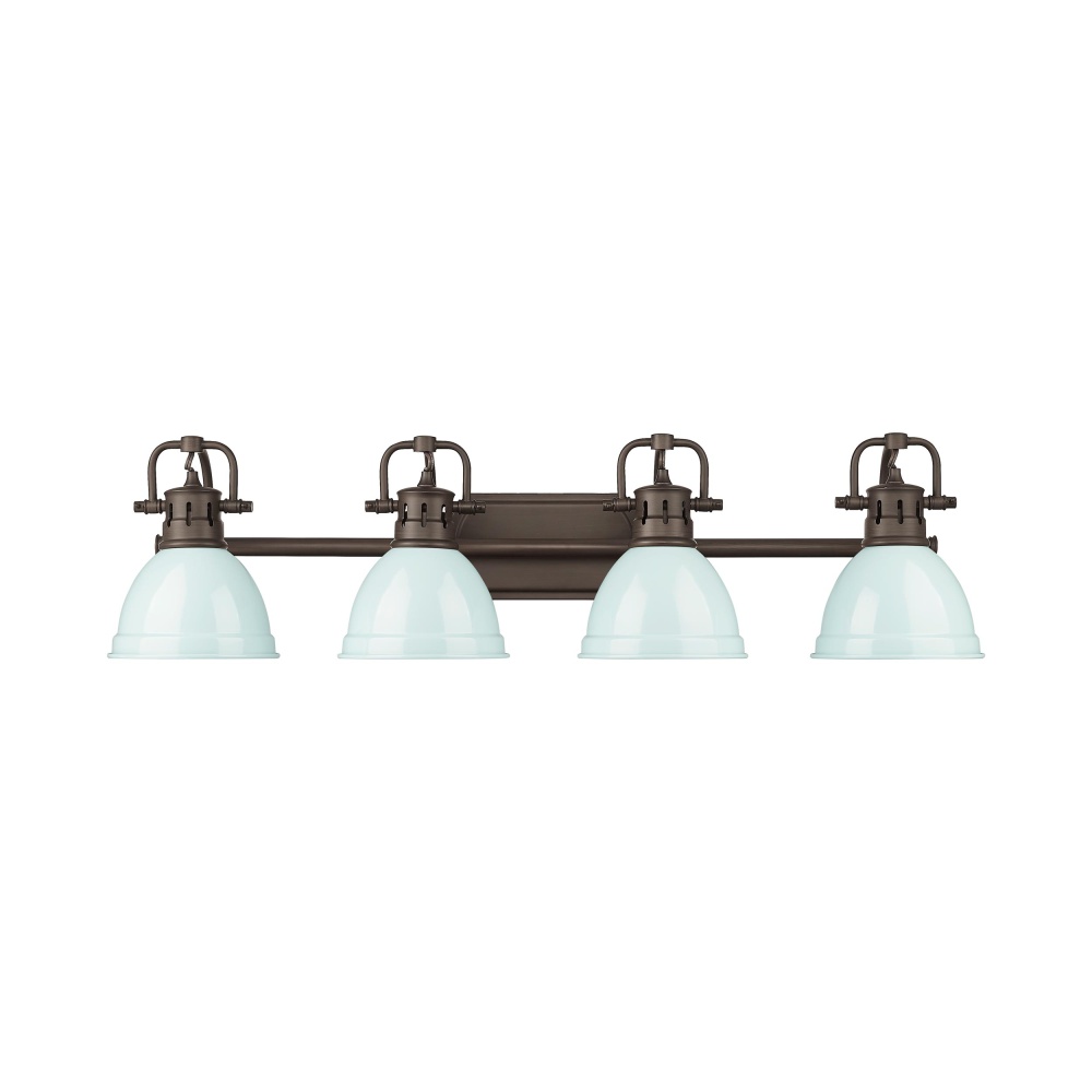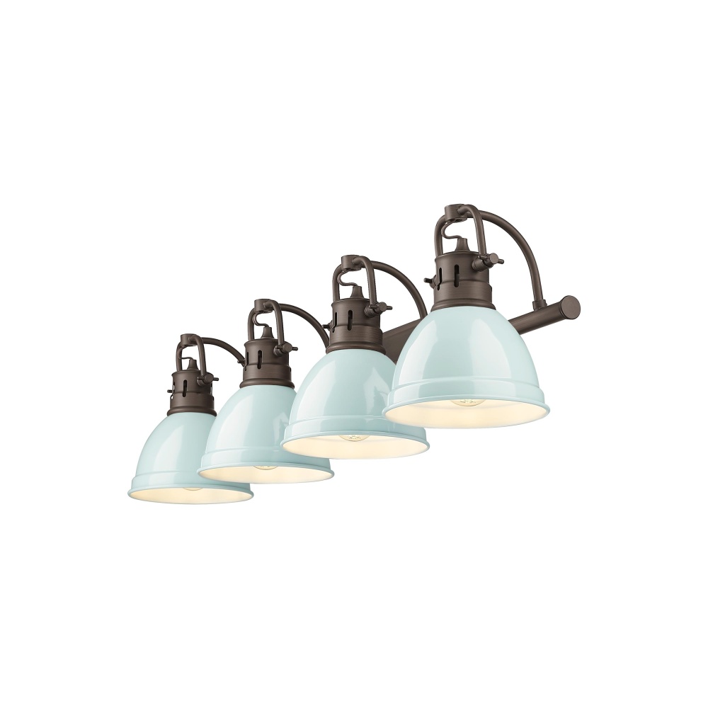 Bring coastal charm into your home with the Yep by Golden Lighting Duncan 4-light Vanity. Featuring a seafoam shade and a rubbed bronze frame, it creates a welcoming atmosphere. The seafoam shade adds a breezy, pastel blue-green touch, evoking serene seaside vibes while its smooth, high-gloss surface enhances light reflection. Our Rubbed Bronze finish brings classic warmth with a hand-rubbed appearance that adds depth. This fixture is perfect for brightening up bathrooms, is damp location rated for covered and semi-enclosed spaces, and includes adjustable directional heads for customized lighting. Overall Dimensions: 33.5"W x 8.5"H x 8.25"D. Requires 4 E26 Medium base bulbs (not included) with a maximum wattage of 100, making it as functional as it is captivating. Elevate your space with style and quality.