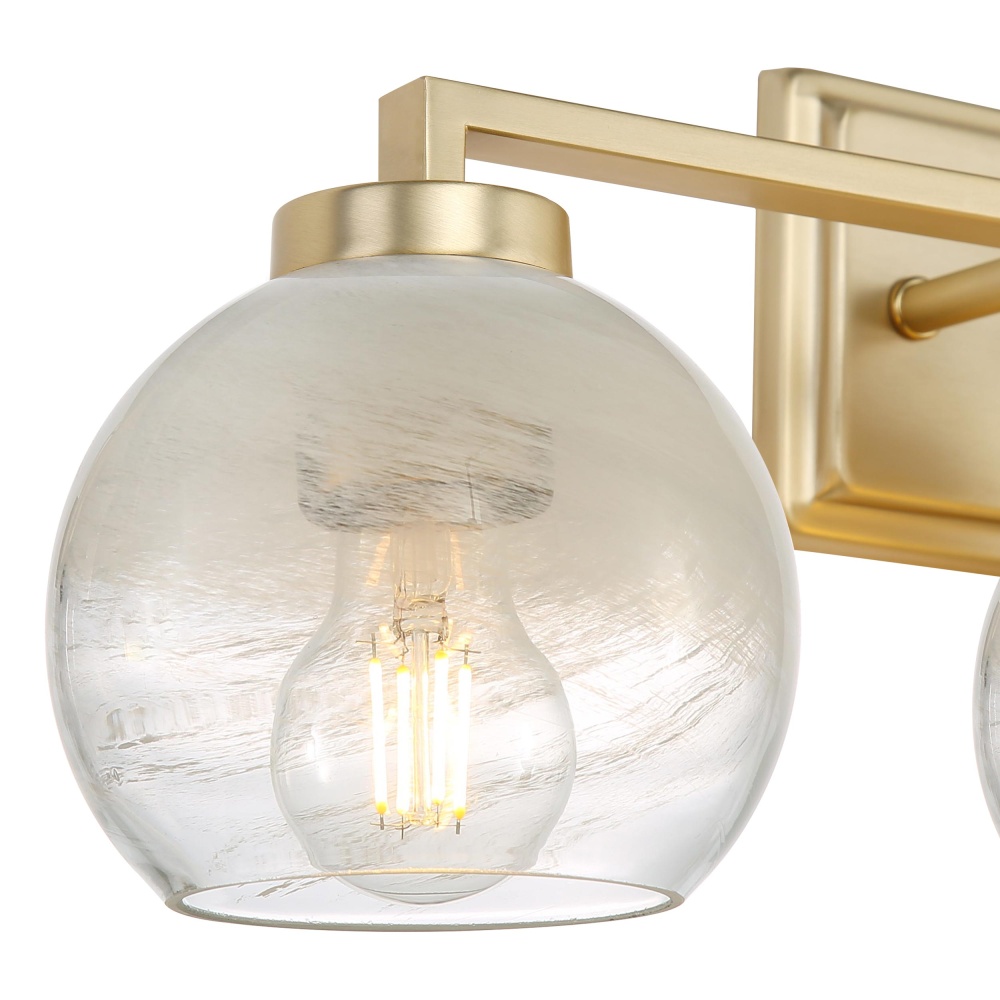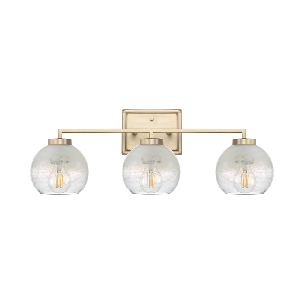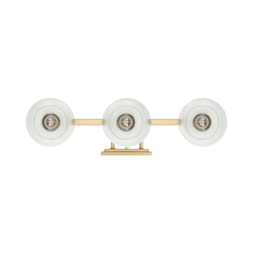 Introduce modern sophistication to your home with the Yep by Golden Lighting Elliott 3-light Vanity in Brushed Champagne Brass and Clear Alabaster Glass. Featuring a glass shade, it creates a welcoming and chic atmosphere. The Clear Alabaster glass shade offers a smooth surface with milky-white swirls, producing a beautifully diffused light effect for a serene ambiance. The brushed champagne brass finish adds understated elegance, combining the warmth of brass with the softness of silver through a durable electroplating process. This fixture is damp location rated, making it ideal for bathrooms and semi-enclosed areas. With dimensions of 24.5"W x 8.75"H x 7"D, it accommodates 3 E26 Medium base bulbs, max 60 watts each. Upgrade your bathroom with this exquisite lighting solution, designed to elevate both style and illumination.