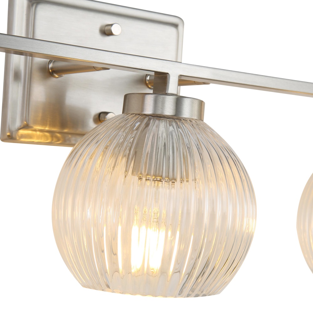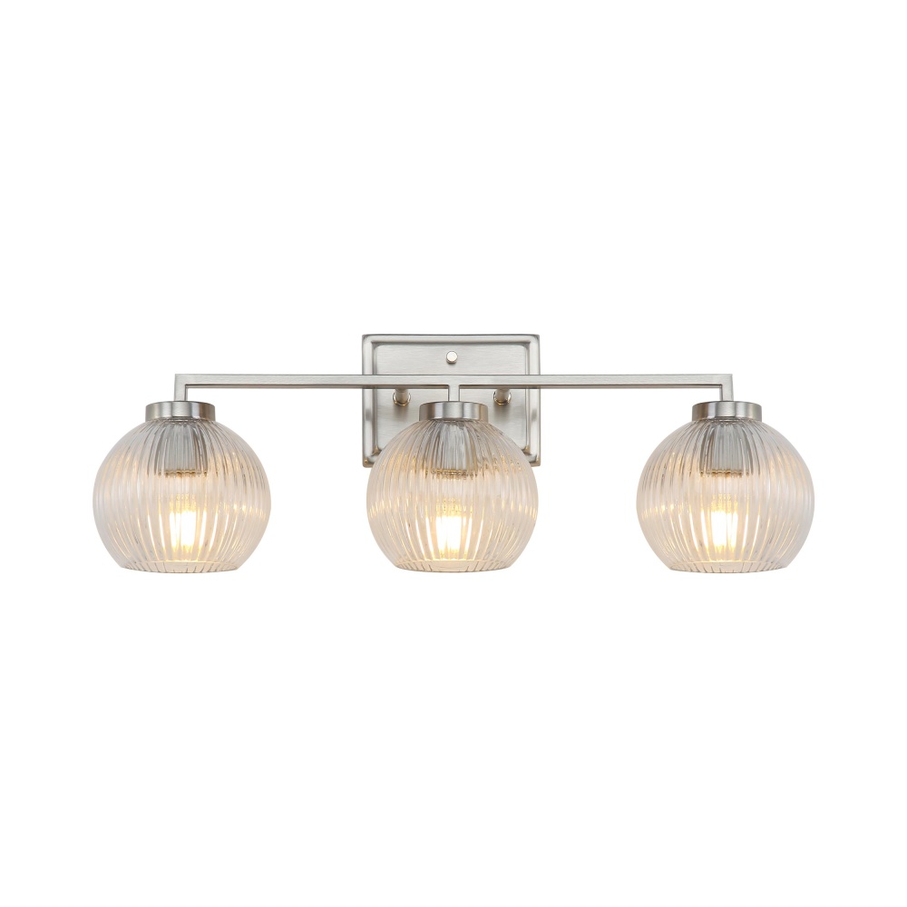 Bring Glam elegance into your home with the Yep by Golden Lighting Elliott 3-light Vanity. Featuring a glass shade and a Pewter frame, it creates a welcoming atmosphere. The Clear Ribbed Glass shade adds a vintage charm with its fine vertical ribs that catch and refract light beautifully. Our Pewter finish offers a soft and classic alternative to brighter silver tones, providing a sophisticated touch to any decor. This vanity light is perfect for brightening up bathrooms while being Damp Location Rated for spaces with occasional moisture. Adjustable installation makes setup a breeze. Dimensions are 24.5"W x 8.75"H x 7"D, requiring 3 E26 Medium base bulbs (not included) with a max 60 wattage per bulb. Experience a perfect blend of modern comfort and timeless style with this stunning fixture.